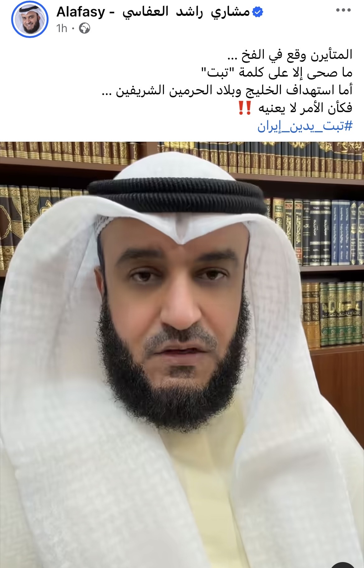 وقال الشيخ مشاري راشد العفاسي خلال الفيديو عبر فيسبوك: “اللي انزعج من كلمة «تبت يدين إيران» لم ينزعج من قصف بلاد الحرمين”.