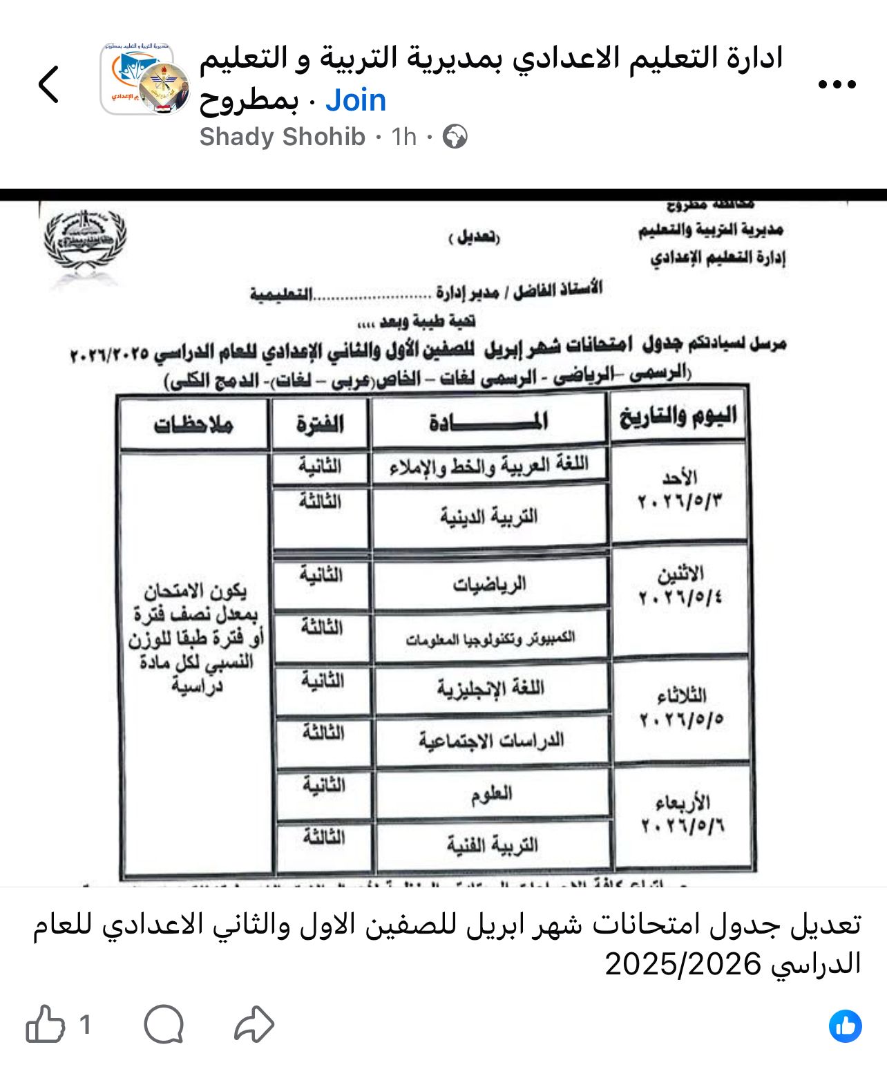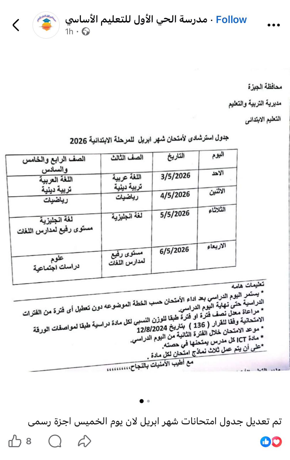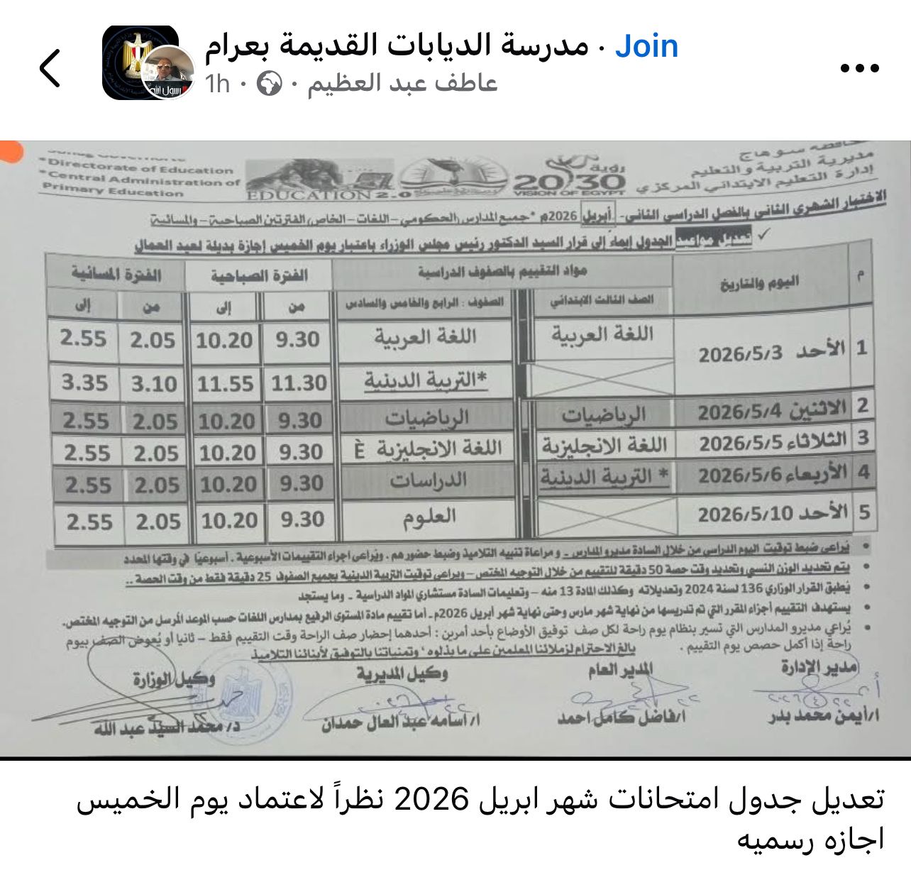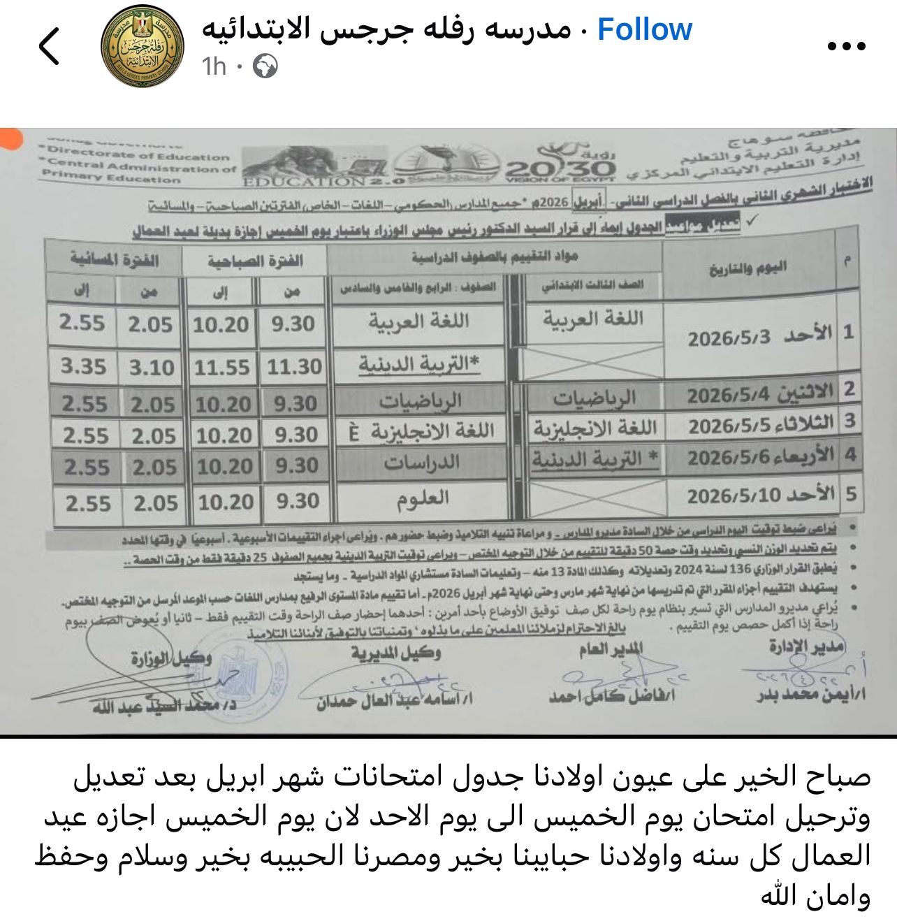 أعلنت مديريات التربية والتعليم ، جدول امتحانات شهر ابريل 2026 جميع الصفوف بعد تعديله بشكل مفاجئ بسبب اجازة عيد العمال