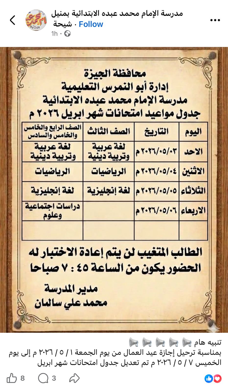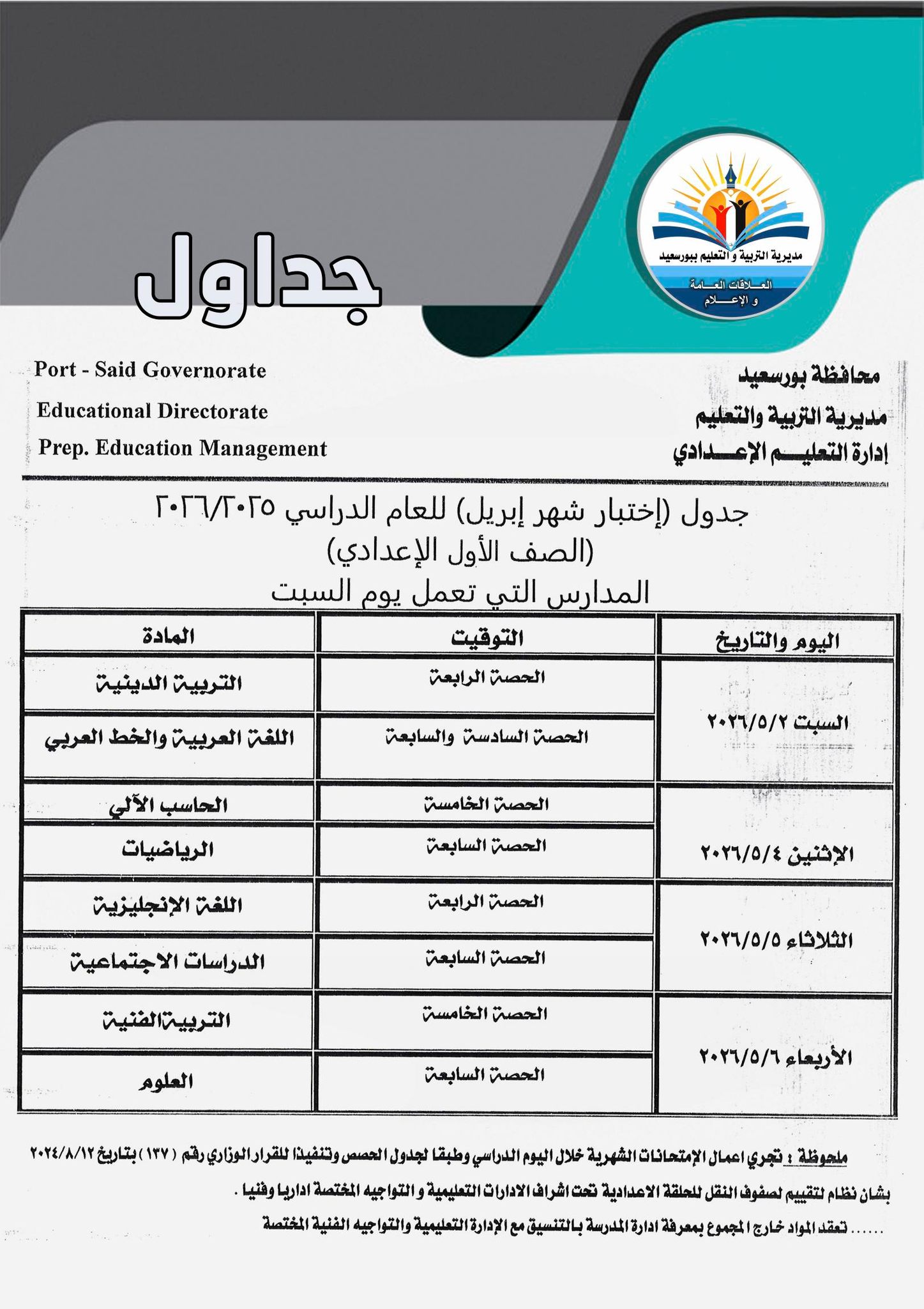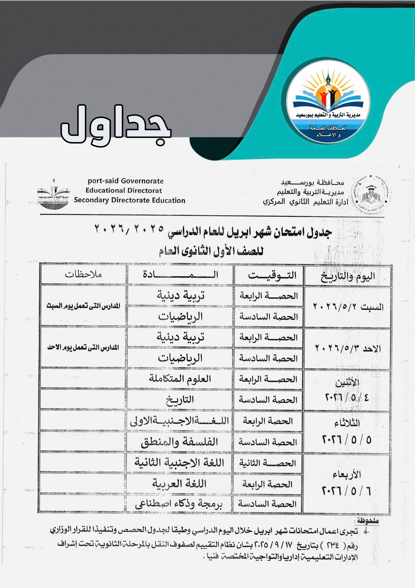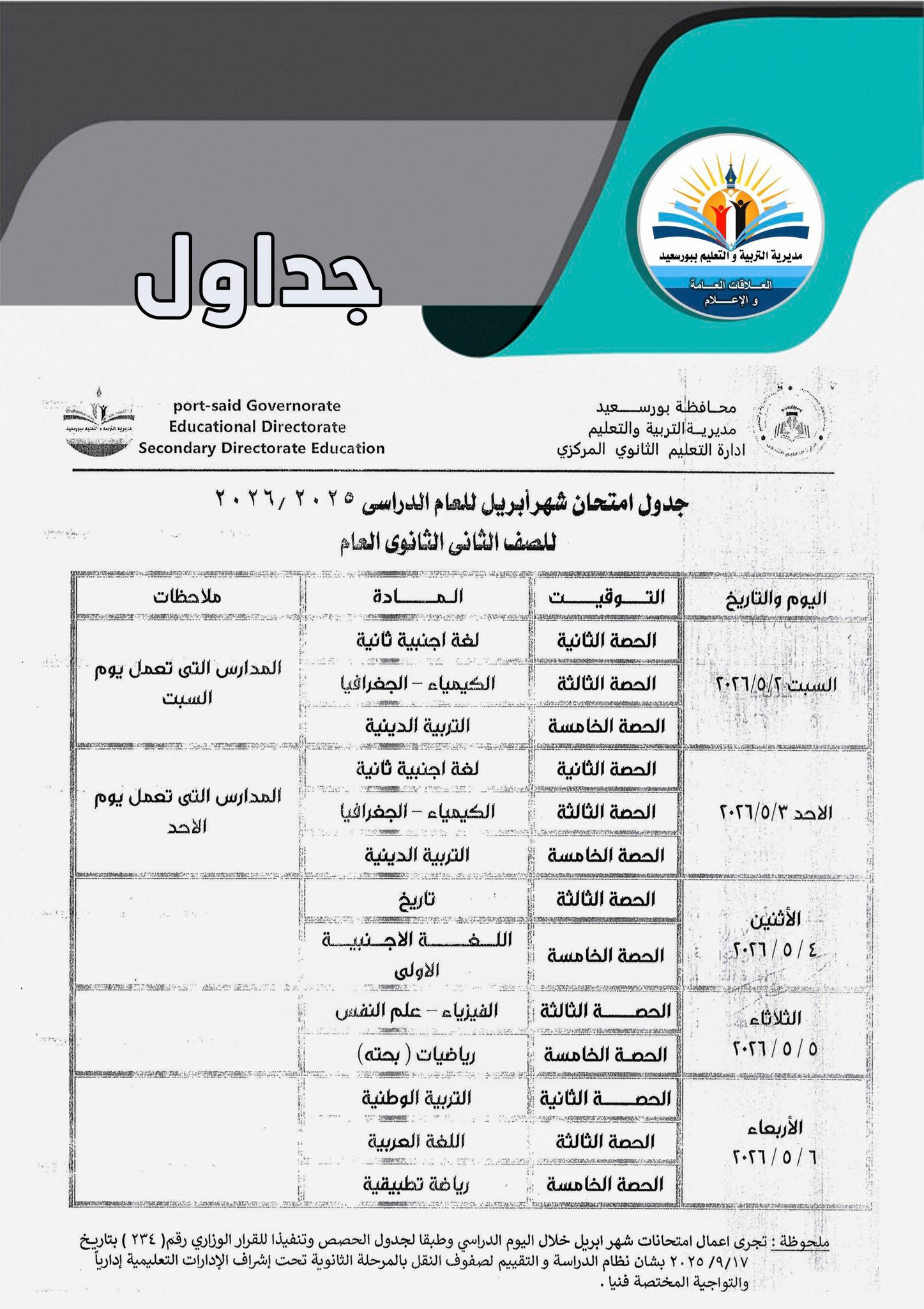 أعلنت مديريات التربية والتعليم ، جدول امتحانات شهر ابريل 2026 جميع الصفوف بعد تعديله بشكل مفاجئ بسبب اجازة عيد العمال