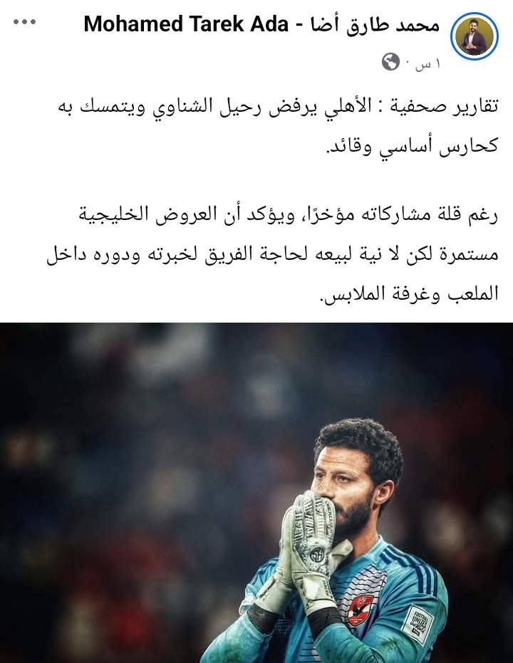 كشفت تقارير صحفية أن النادي الأهلي يرفض التفريط في حارس مرماه محمد الشناوي، ويتمسك باستمراره كحارس أساسي وقائد للفريق.