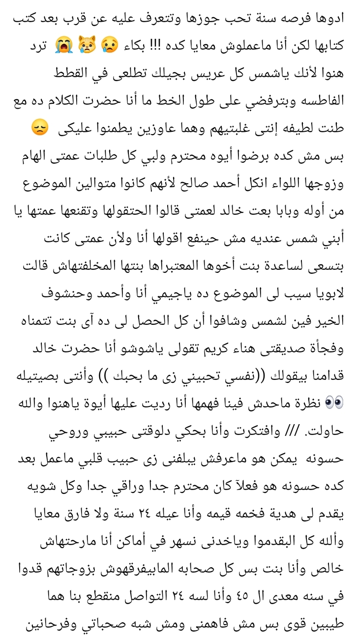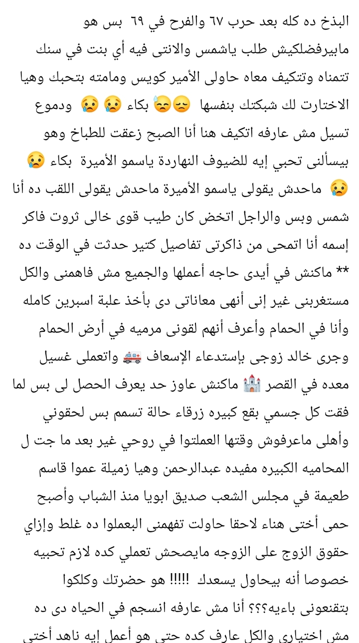 كما تحدثت عن تدخل عدد من أفراد العائلة ومحاولاتهم المستمرة لاحتواء حالتها، ومحاولة فهم أسباب رفضها للواقع الجديد، في ظل تأكيدهم على أن زوجها كان شخصًا طيبًا ويسعى لإسعادها، وأن المشكلة كانت في عدم التوافق النفسي والاختلاف في التوقعات.