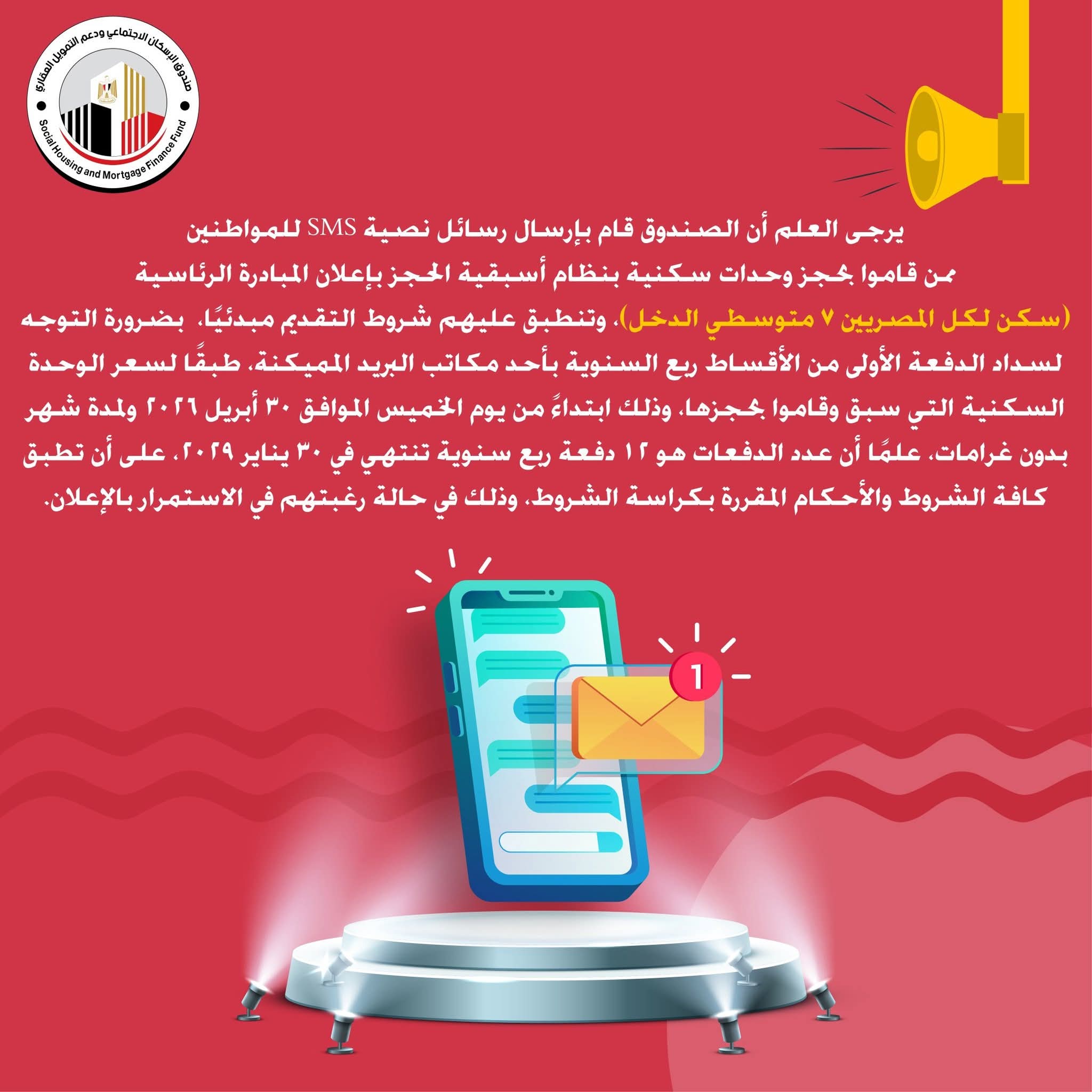 وأوضح الصندوق أن الرسائل تضمنت تنبيهًا بضرورة توجه المواطنين لسداد الدفعة الأولى من الأقساط ربع السنوية، من خلال مكاتب البريد المميكنة، وذلك وفقًا للأسعار المحددة للوحدات التي تم حجزها مسبقًا.