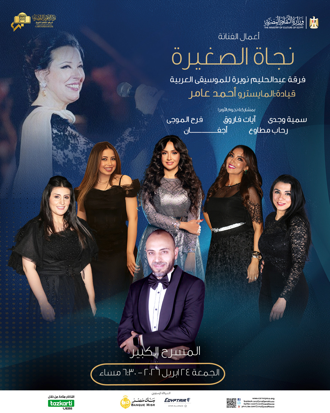 تواصل دار الأوبرا المصرية رسالتها للإحتفاء بأعلام الموسيقى والطرب حيث تقيم حفلاً لفرقة عبد الحليم نويرة للموسيقى العربية بقيادة المايسترو أحمد عامر فى السابعة والنصف مساء الجمعة 24 أبريل على المسرح الكبير يضم نخبة مختارة من أعمال نجاة الصغيرة التى تعد إحدى أيقونات الغناء منها حمد الله ع السلامة، بان عليا حبه، انا بستناك وغيرها .. اداء سمية وجدى، آيات فاروق، فرح الموجى، رحاب مطاوع، أجفان .