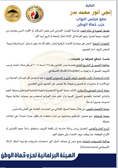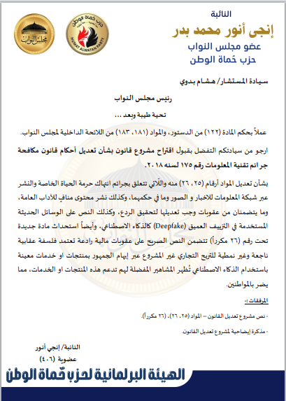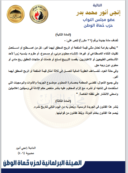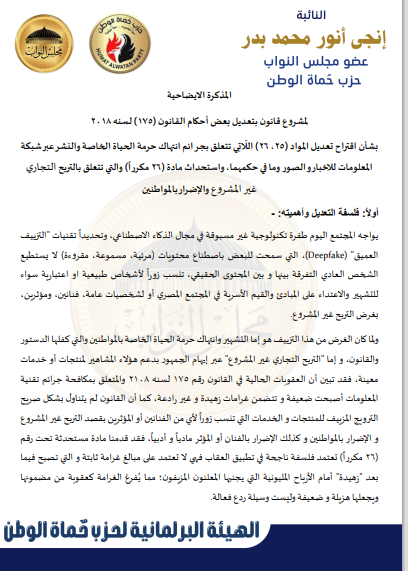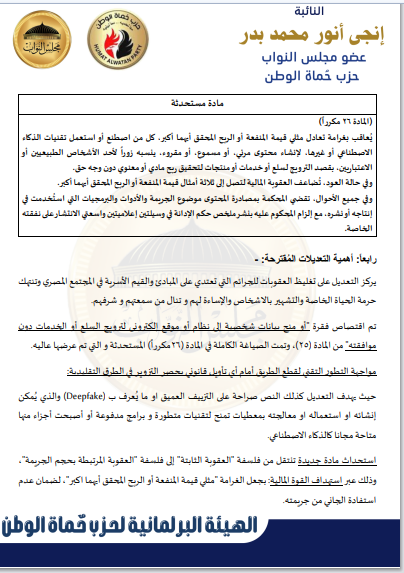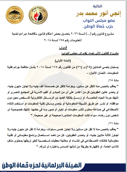 بحصل موقع صدي البلد علي نص مشروع القانون الذي تقدمه به النائبة إنجي أنور، وكيل لجنة الإعلام والثقافة والآثار بمجلس النواب عن حزب حماة الوطن، بشأن مكافحة جرائم تقنية المعلومات، يمثل نقلة نوعية في مواجهة الجرائم المرتبطة بالذكاء الاصطناعي، وعلى رأسها “التزييف العميق” (Deepfake).