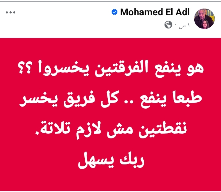 وكتب العدل قبل اللقاء عبر حسابه علي فيسبوك: “هو ينفع الفرقتين يخسروا؟ طبعًا ينفع.. كل فريق يخسر نقطتين مش لازم تلاتة.. ربك يسهل” وأثارت تصريحاته تفاعلًا واسعًا بين الجماهير على مواقع التواصل الاجتماعي، خاصة مع أهمية المباراة في سباق المنافسة على لقب الدوري.