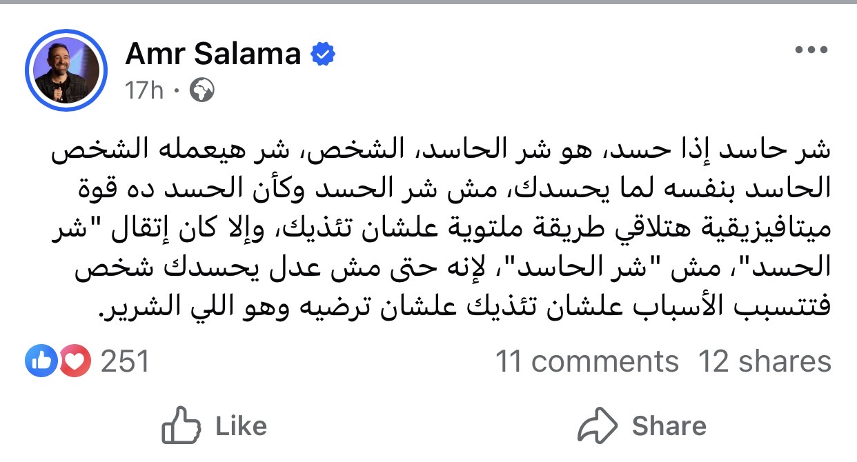 أثار المخرج عمرو سلامة حالة من الجدل عبر حسابه على مواقع التواصل الاجتماعي، بعد طرحه تفسيرًا لآية «من شر حاسد إذا حسد».