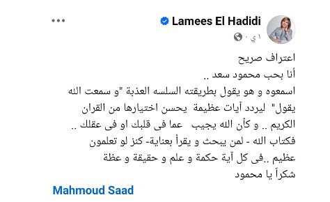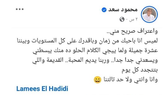 "واعتراف صريح مني..لميس انا باحبك من زمان وباقدرك على كل المستويات وبيننا عشرة جميلة ولما ييجي الكلام الحلو ده منك يبسطني ويسعدني جدا جدا.. وربنا يديم المحبة.. القديمة واللي بتتجدد كل يوم ..وانا وانتي ولا حد تالتنا ".