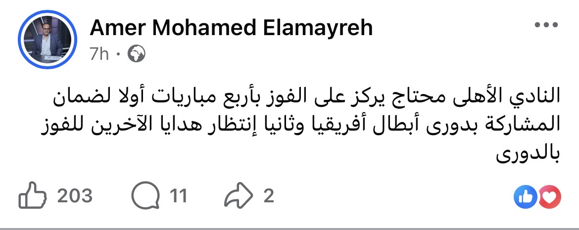 وكتب العمايرة عبر فيسبوك: “النادي الأهلى محتاج يركز على الفوز بأربع مباريات أولا لضمان المشاركة بدورى أبطال أفريقيا وثانيا إنتظار هدايا الآخرين للفوز بالدورى”.