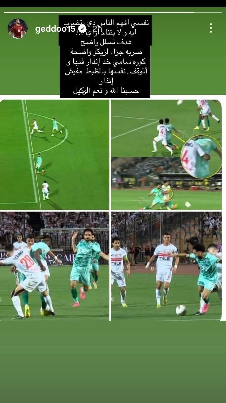 وكتب جدو عبر حسابه على انستجرام: "نفسي أفهم الناس دي بتنام ازاي.. هدف تسلل واضح وضربة جزاء لزيكو.. حسبي الله ونعم الوكيل".