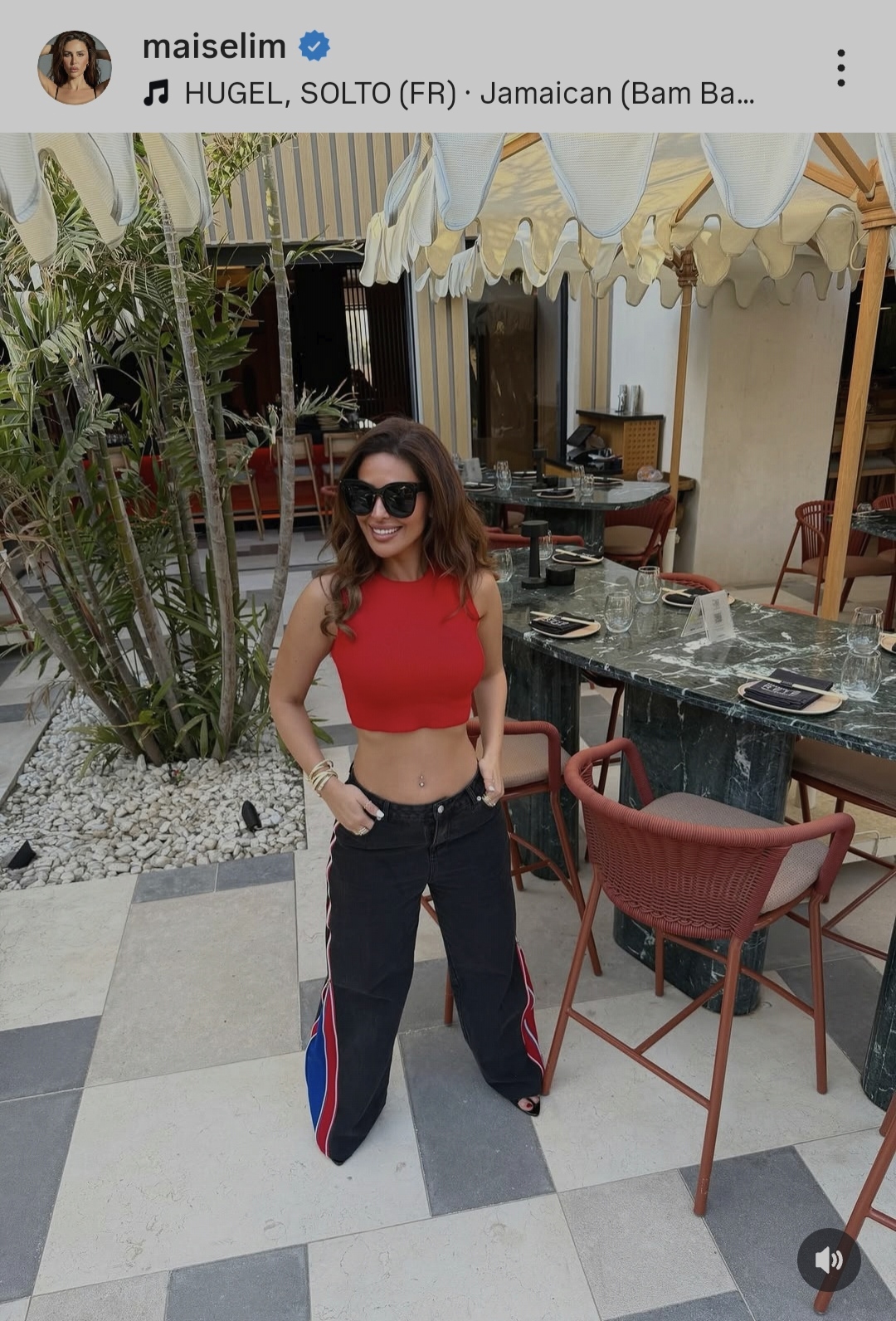 وظهرت مي سليم بإطلالة جذابة لافته مرتدية هاف ستومك باللون الأحمر نسقت معه بنطلون أسود، لتكشف عن جمالها ورشاقتها .