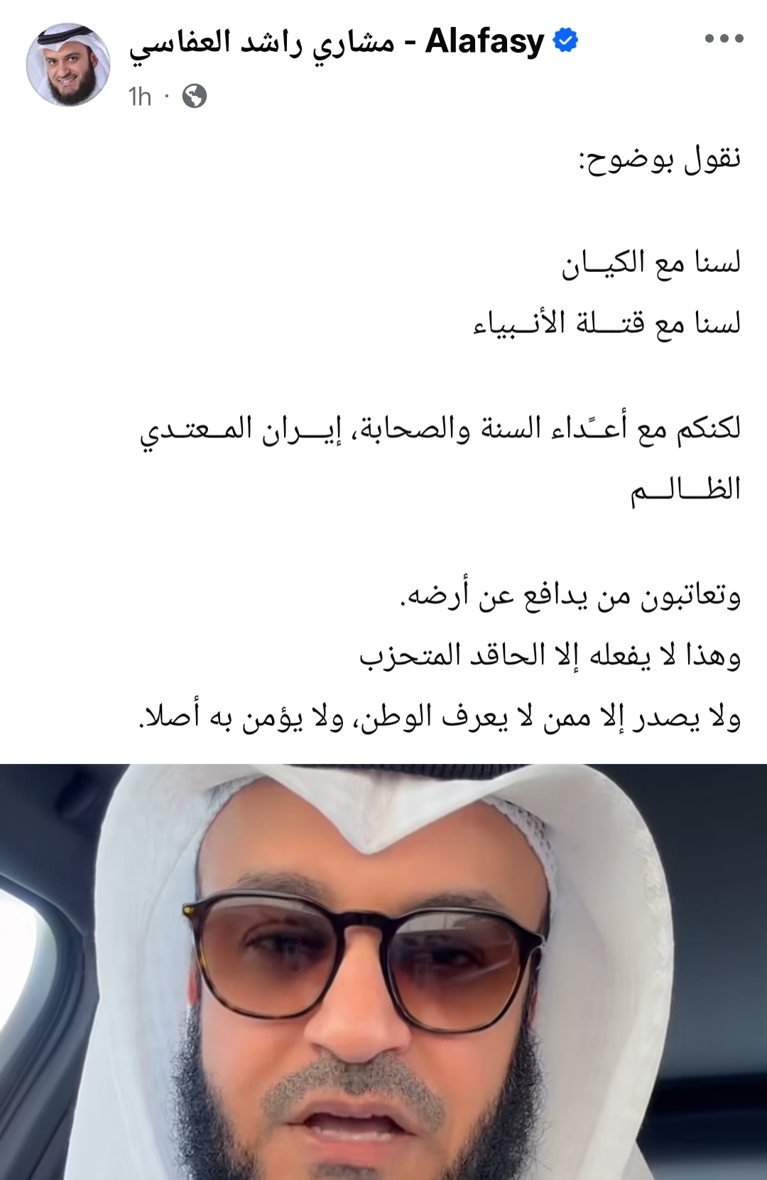 وقال العفاسي في فيديو عبر حسابه علي فيسبوك: «نقول بوضوح: لسنا مع الكيان، ولسنا مع قتلة الأنبياء، لكنكم مع أعداء السنة والصحابة، إيران المعتدي الظالم، وتعاتبون من يدافع عن أرضه، وهذا لا يفعله إلا الحاقد المتحزب، ولا يصدر إلا ممن لا يعرف الوطن ولا يؤمن به أصلاً».