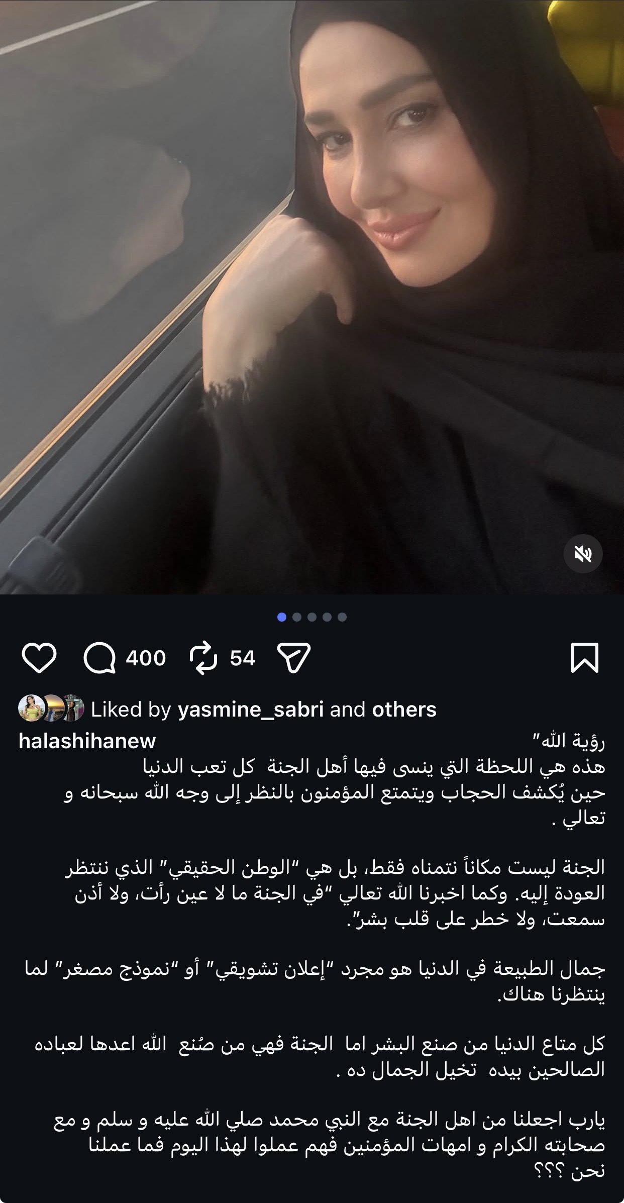 نشرت الفنانة حلا شيحة عبر حسابها على موقع إنستجرام منشورًا جديدًا حمل طابعًا روحانيًا وتأمليًا، تحدثت فيه عن مفهوم رؤية الله ونعيم الجنة، مستعرضة تصورها للحياة الآخرة مقارنة بالحياة الدنيا.