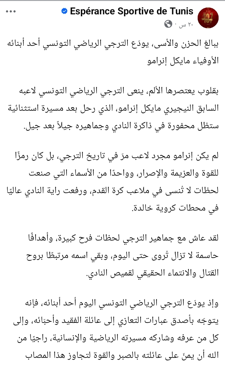وأكد النادي، في بيان رسمي، أن إينرامو لم يكن مجرد لاعب مرّ في تاريخ الترجي، بل كان رمزًا للقوة والعزيمة والإصرار، وأحد الأسماء التي صنعت لحظات لا تُنسى في ملاعب كرة القدم، ورفعت راية الفريق عاليًا في محطات كروية خالدة.