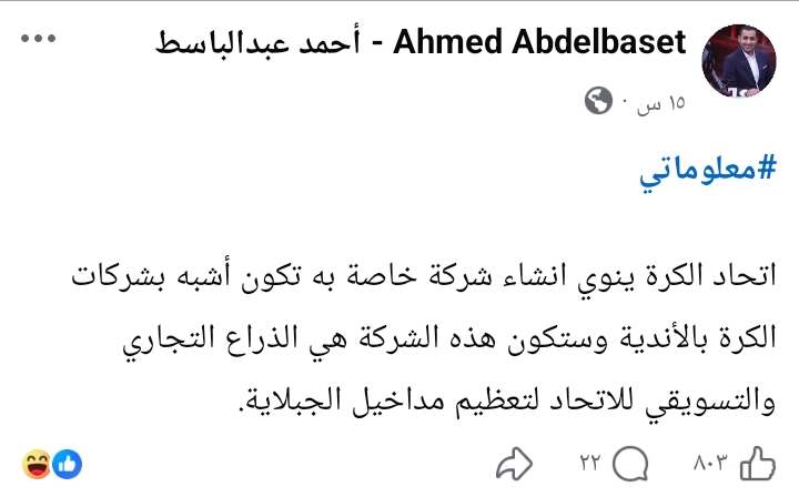 وكتب أحمد عبد الباسط عبر حسابه على فيسبوك أن الشركة المنتظرة ستعمل بنظام مشابه لشركات كرة القدم التابعة للأندية، على أن تتولى إدارة الملفات التجارية والتسويقية، بهدف تعظيم موارد الجبلاية وزيادة مصادر الدخل.