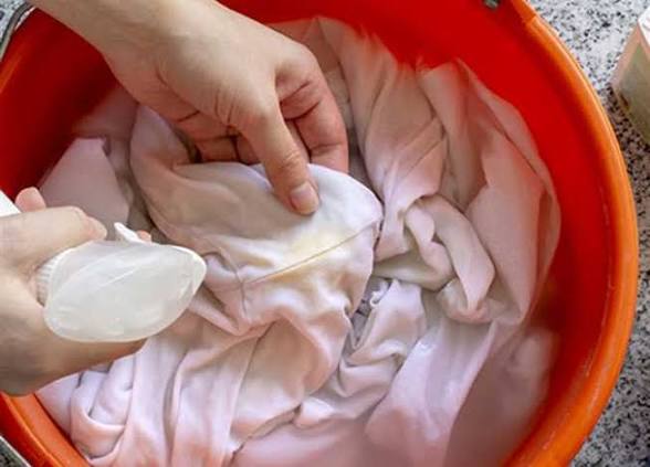 نقع الملابس في ماء مضاف إليه كوب من الخل الأبيض لمدة ساعة.