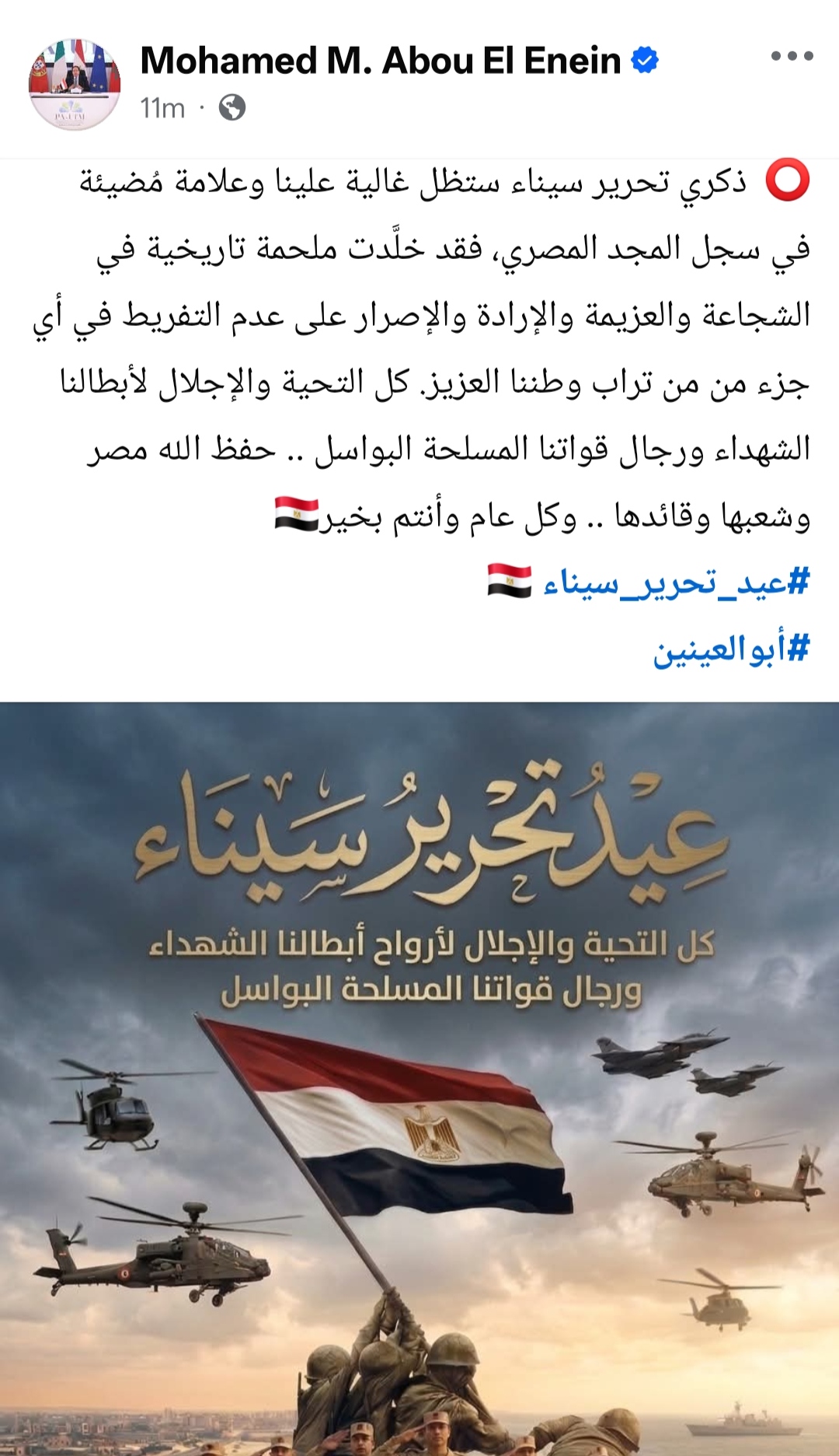 و كتب النائب محمد أبو العينين عبر حسابه بموقع فيسبوك :ذكري تحرير سيناء ستظل غالية علينا وعلامة مُضيئة في سجل المجد المصري، فقد خلَّدت ملحمة تاريخية في الشجاعة والعزيمة والإرادة والإصرار على عدم التفريط في أي جزء من من تراب وطننا العزيز.