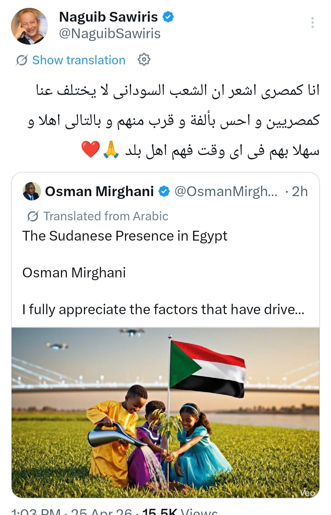 وكتب نجيب ساويرس ، عبر حسابه بموقع أكس: أنا كمصري أشعر أن الشعب السودانى لا يختلف عنا كمصريين وأحس بألفة وقرب منهم وبالتالى أهلا وسهلا بهم فى أى وقت فهم أهل بلد.