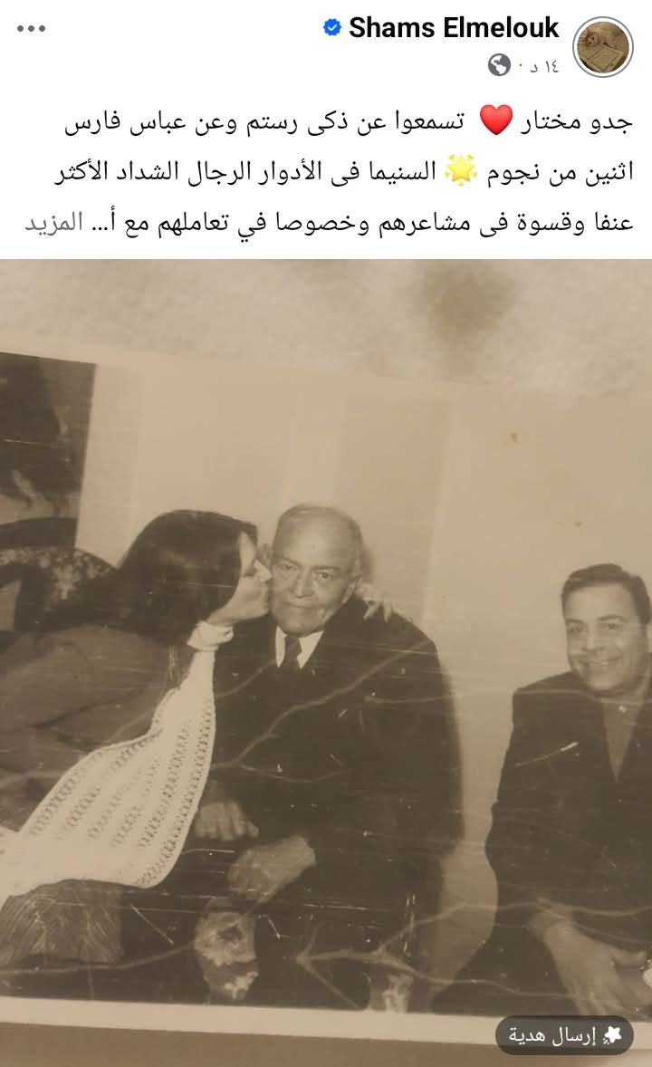 نشرت الفنانة المعتزلة شمس البارودي منشورا إنسانيا استعادت فيه ذكريات خاصة من طفولتها مع جدها مختار، متحدثة عن مواقف مؤثرة جمعتها به وعن طبيعته الصارمة مع الآخرين مقابل حنانه الكبير معها.
