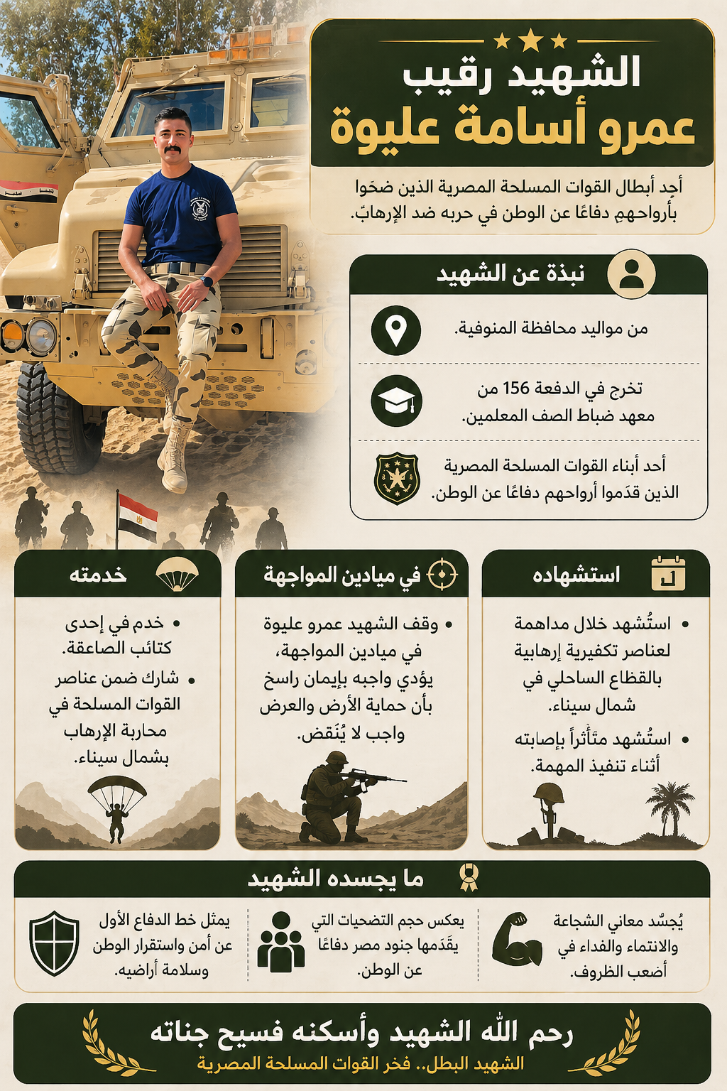 في زمن تختبر فيه الأوطان معادن رجالها، يخرج من بين الصفوف رجال لا يعرفون التراجع، يحملون أرواحهم على أكفهم، ويكتبون بدمائهم سطور المجد، ومن بين هؤلاء، يبرز اسم الشهيد رقيب عمرو أسامة عليوة، الذي لم يكن مجرد جندي، بل كان حكاية وطن تروى وبطولة لا تنسى.