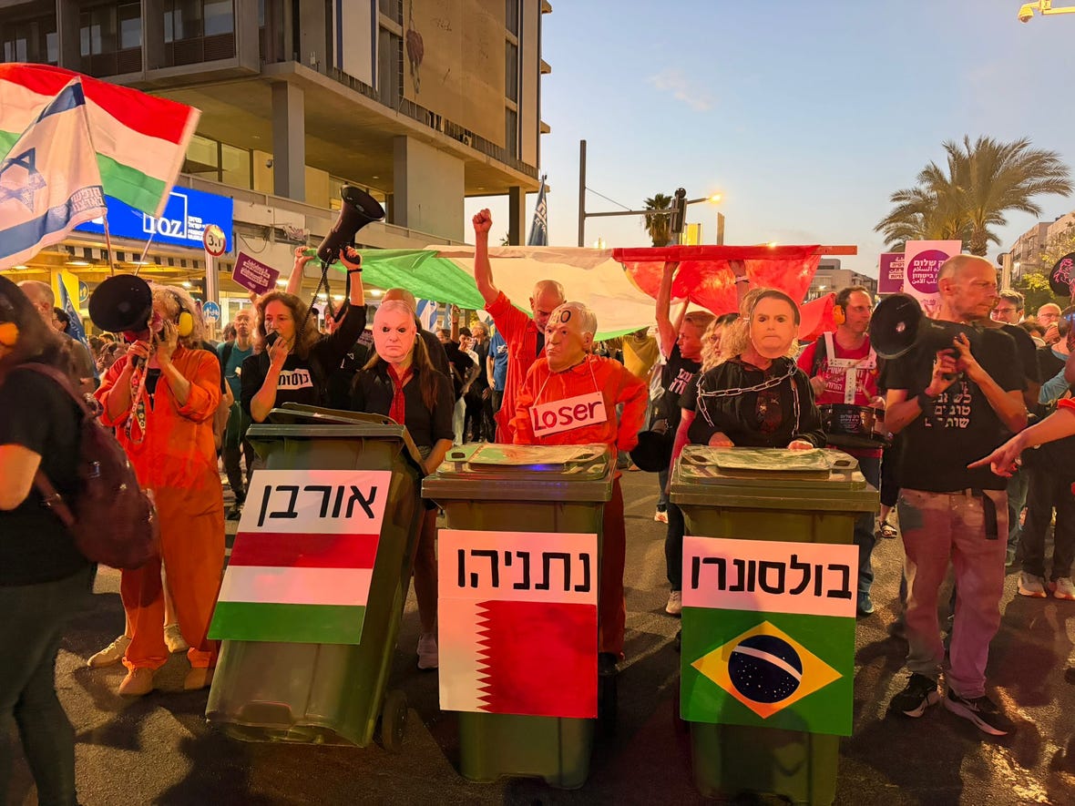 وفي تل أبيب، انطلقت مسيرة من محيط السفارة المجرية باتجاه ساحة هابيما، حيث حمل بعض المتظاهرين لافتات ورموزاً ساخرة من قيادات يمينية دولية، في تعبير رمزي عن رفضهم لسياسات اليمين الشعبوي. كما رفع المحتجون شعارات تدعو إلى “الأمل والتغيير” بلغات متعددة.