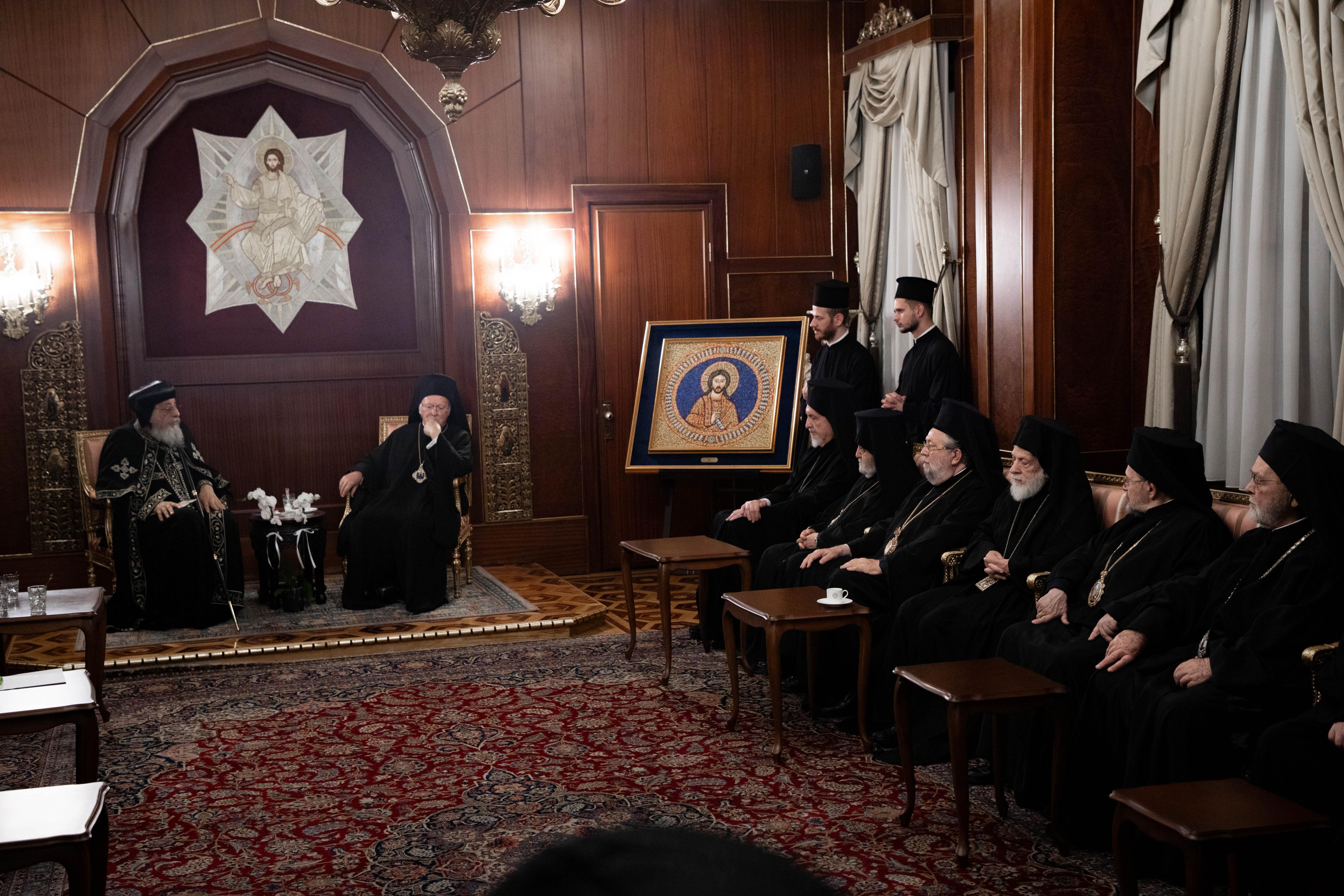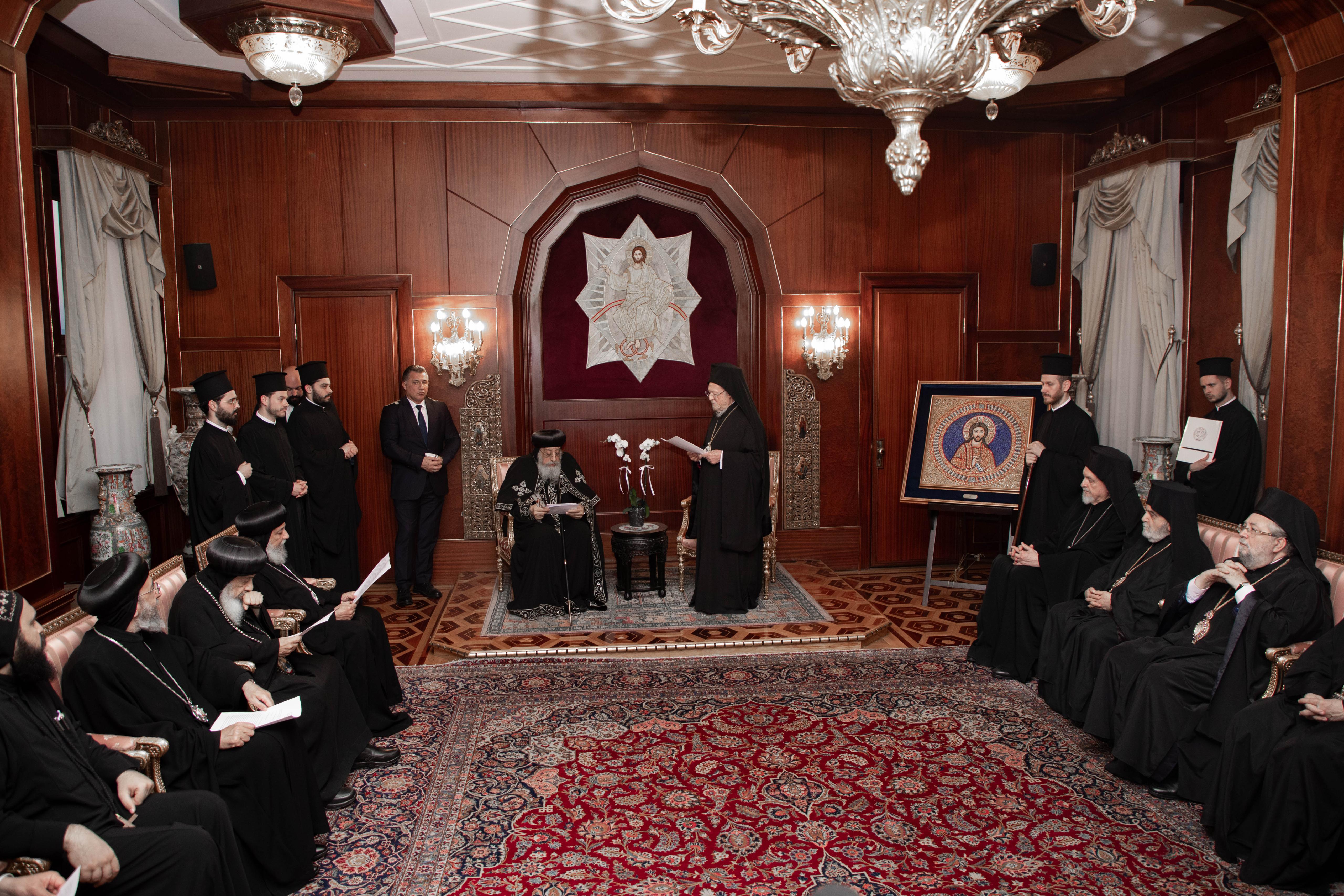 وألقى قداسة البطريرك المسكوني كلمة رحب في بدايتها بقداسة البابا تواضروس الثاني والوفد المرافق، واصفًا حضور قداسة البابا إلى مقر البطريركية المسكونية، بأنه بركة وإشارة رجاء لا يقوم على مجهود بشري وحسب، بل على نعمة الروح القدس الذي بمحبة المسيح يجمعنا نحو الوحدة، وبأن مجئ قداسته إلى القسطنطينية يتخطى كثيرًا حدود المناسبة الرسمية، إذ يحمل دلالة تاريخية عميقة، كونها الزيارة الأولى وأنه ثمرة مباشرة للقاء الأخوي الذي استضافه قداسة البابا تواضروس في سبتمبر ٢٠٢٤ بدير القديس الأنبا بيشوي في مصر.