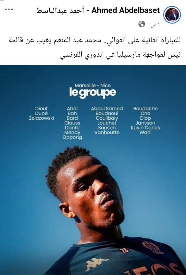يواصل المدافع المصري محمد عبد المنعم الغياب عن قائمة فريقه نيس للمباراة الثانية على التوالي، وذلك قبل المواجهة المرتقبة أمام مارسيليا ضمن منافسات الدوري الفرنسي.