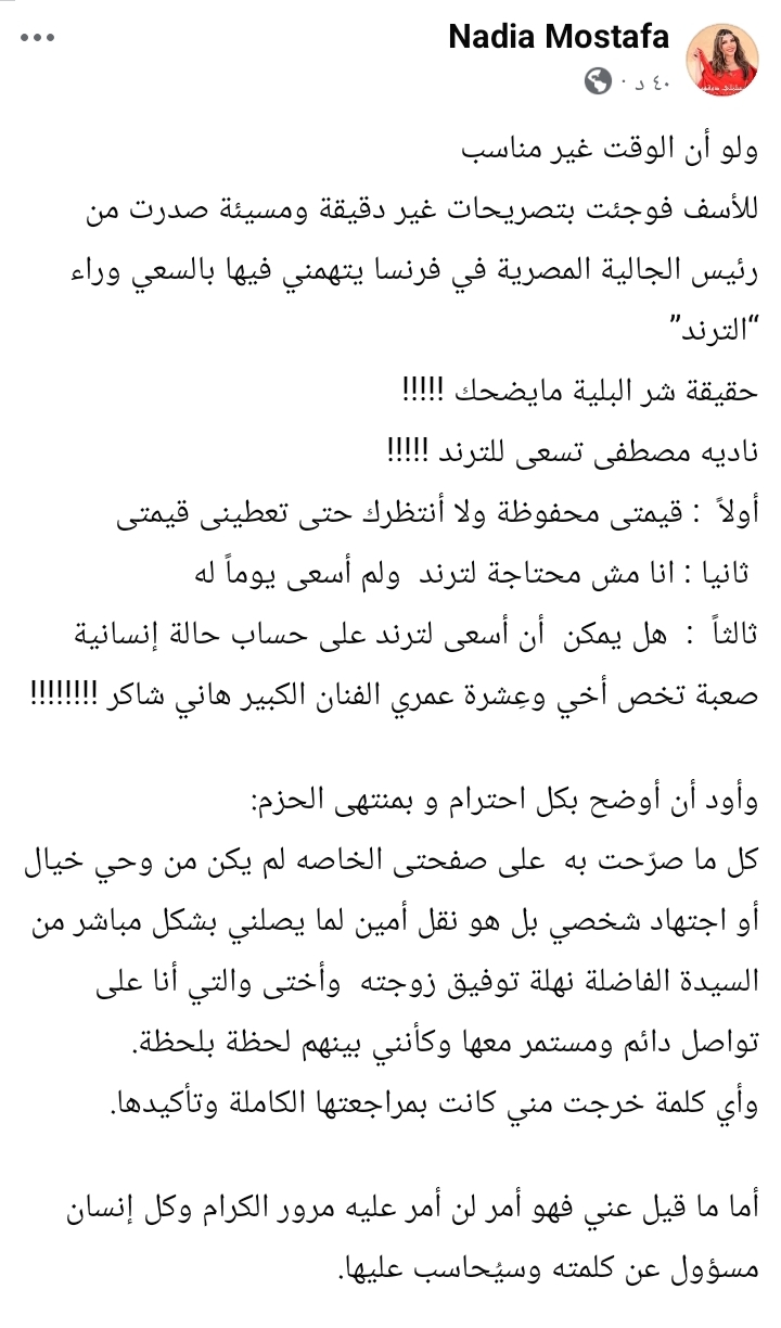 أصدرت الفنانة نادية مصطفى، المتحدث الرسمي باسم نقابة المهن الموسيقية، بيانًا ردّت فيه على التصريحات التي نُسبت إلى رئيس الجالية المصرية في فرنسا، والتي اتهمها خلالها بالسعي وراء “الترند”، مؤكدة استياءها الشديد مما وصفته بتصريحات غير دقيقة ومسيئة.