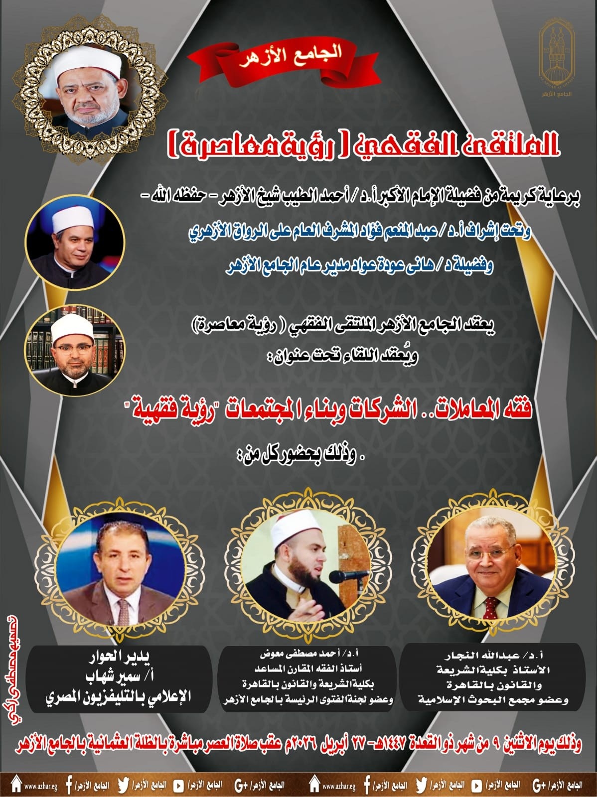 يأتي هذا اللقاء برعاية كريمة من الإمام الأكبر أ.د أحمد الطيب، شيخ الأزهر، حيث يعقد غداً الجامع الأزهر، الملتقى الفقهي بين الشرع والطب الثاني والخمسون بعنوان "رؤية معاصرة"، والذي يناقش على مائدته: فقه المعاملات.. الشركات وبناء المجتمعات "رؤية فقهية" ويستضيف الملتقى: أ.د عبد الله النجار، أستاذ الفقه بكلية الشريعة والقانون بالقاهرة، وعضو مجمع البحوث الإسلامية، وأ.د أحمد مصطفى معوض، أستاذ الفقه المقارن المساعد بكلية الشريعة والقانون بالقاهرة، وعضو لجنة الفتوى الرئيسة بالجامع الأزهر، ويُدير الحوار ا/ سمير شهاب، الإعلامي بالتلفزيون المصري.