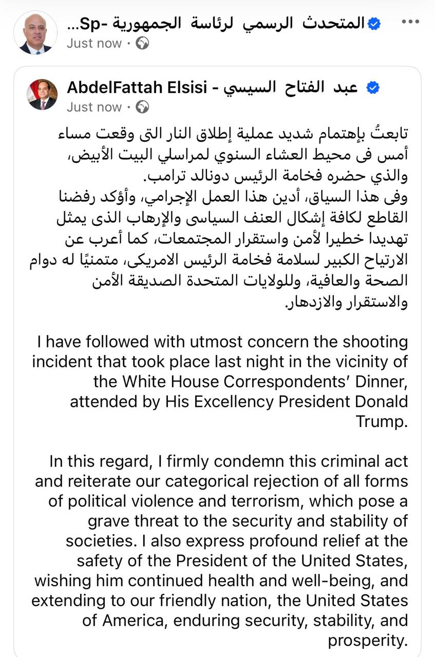وقال الرئيس السيسي - في تدوينة له على حسابه الرسمي على موقع التواصل الاجتماعي فيسبوك- : "تابعتُ باهتمام شديد عملية إطلاق النار التي وقعت مساء أمس في محيط العشاء السنوي لمراسلي البيت الأبيض، والذي حضره الرئيس دونالد ترامب.