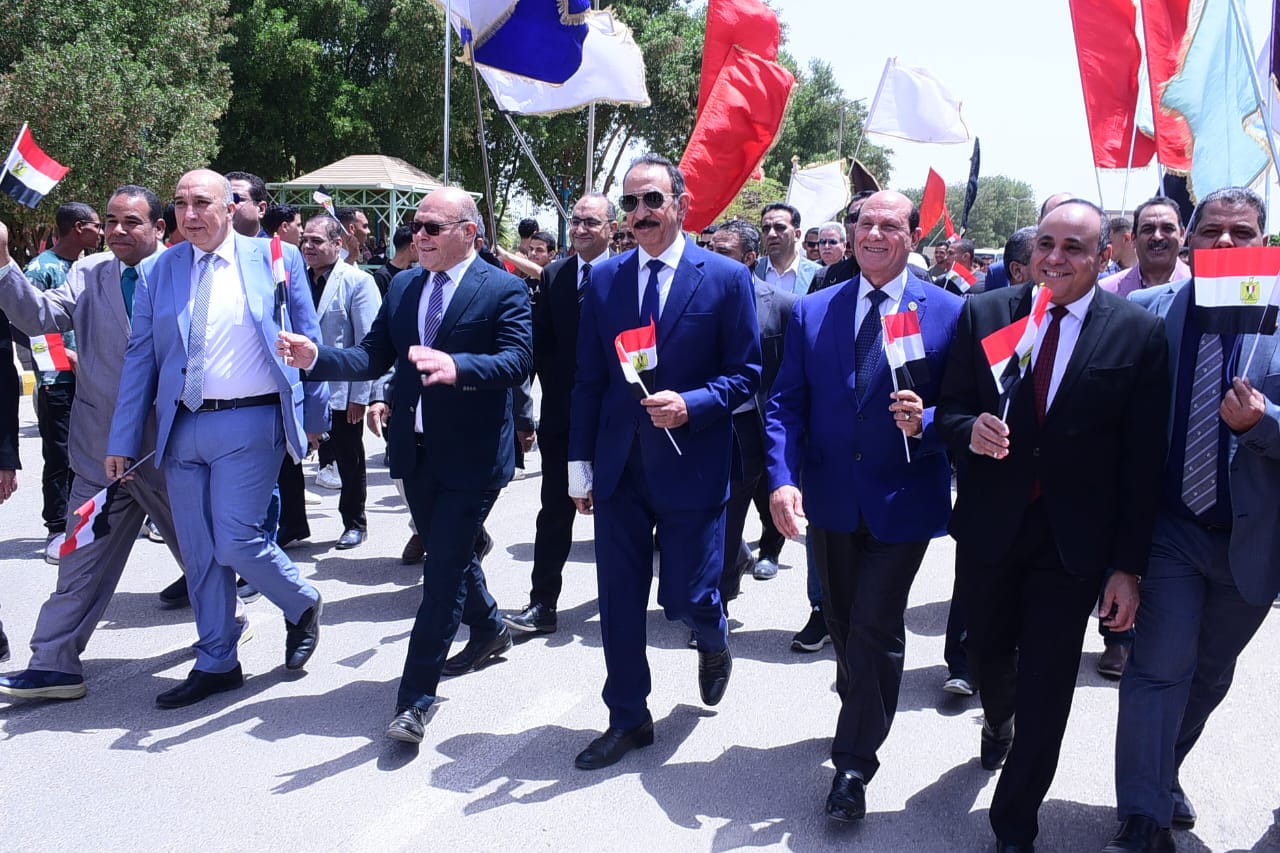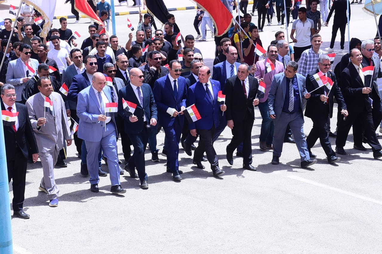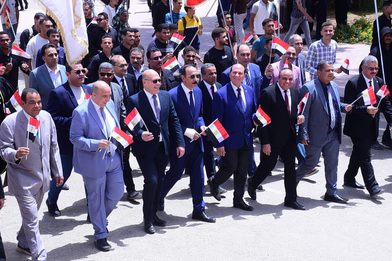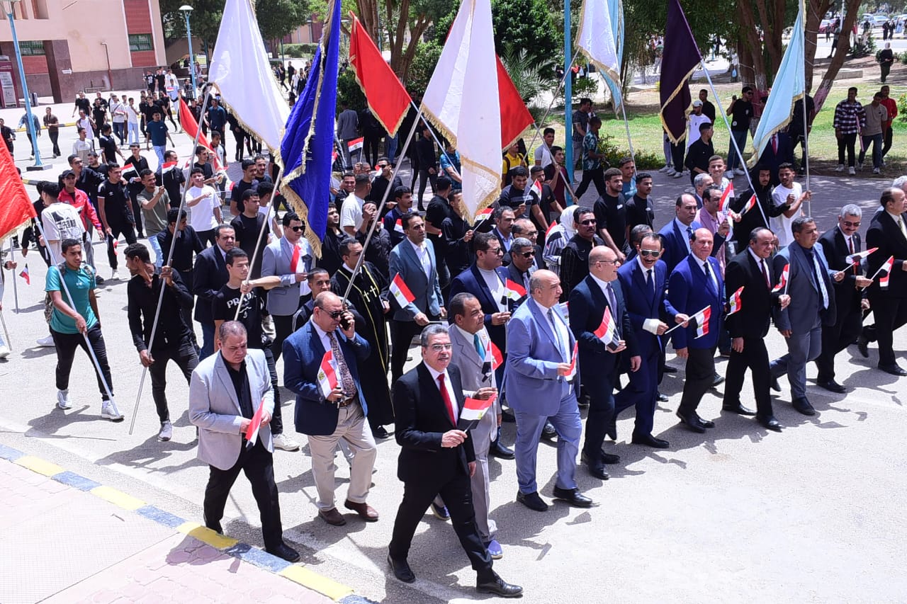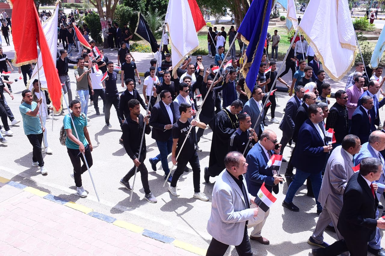 وخلال المسيرة رفع الطلاب أعلام مصر، وردد المشاركون الهتافات الوطنية التي عبرت عن حب الوطن والاعتزاز بتضحيات القوات المسلحة الباسلة، مؤكدين أن ذكرى تحرير سيناء ستظل رمزًا للفخر والعزة والإرادة المصرية.