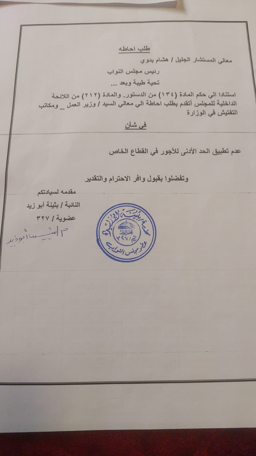 تقدمت النائبة بثينة أبو زيد، عضو مجلس النواب، بطلب إحاطة موجّه إلى الحكومة بشأن عدم تطبيق الحد الأدنى للأجور داخل عدد من منشآت القطاع الخاص، مطالبة باتخاذ إجراءات عاجلة لضمان تنفيذ القانون وحماية حقوق العاملين.