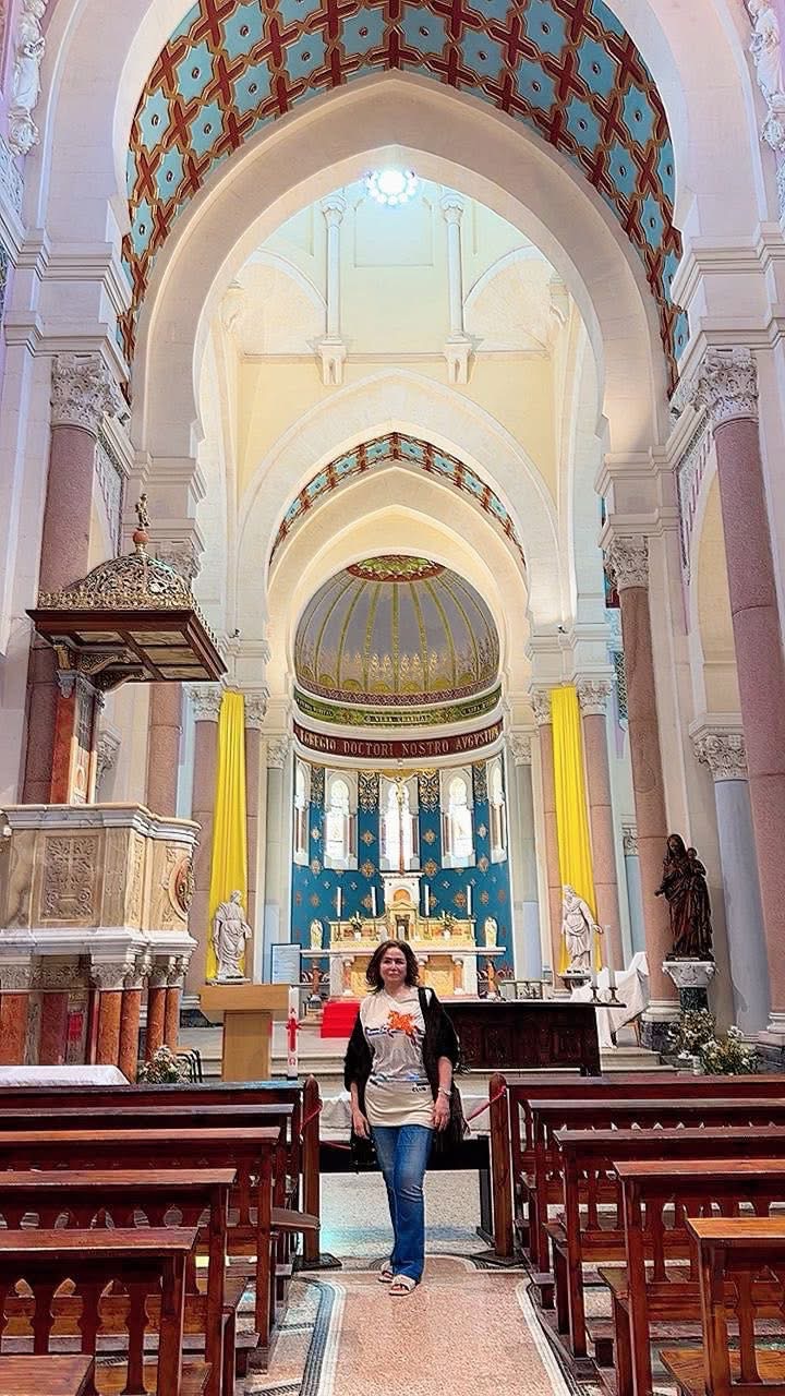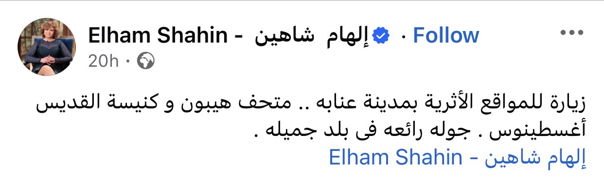 وعلقت إلهام شاهين على الصور قائلة: “زيارة للمواقع الأثرية بمدينة عنابة.. متحف هيبون وكنيسة القديس أغسطينوس..جولة رائعة في بلد جميلة”.