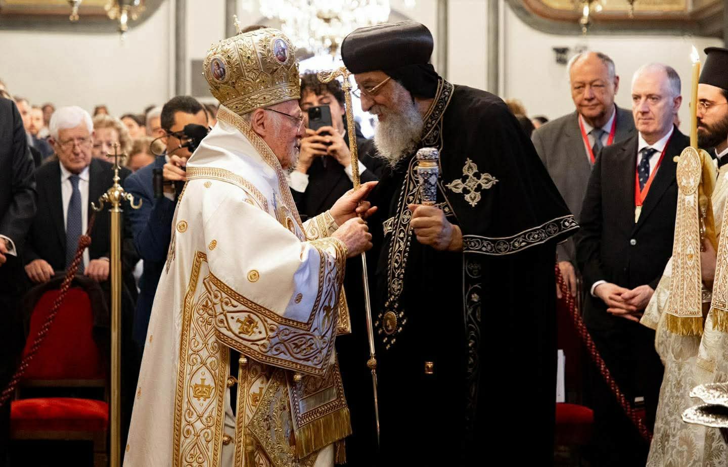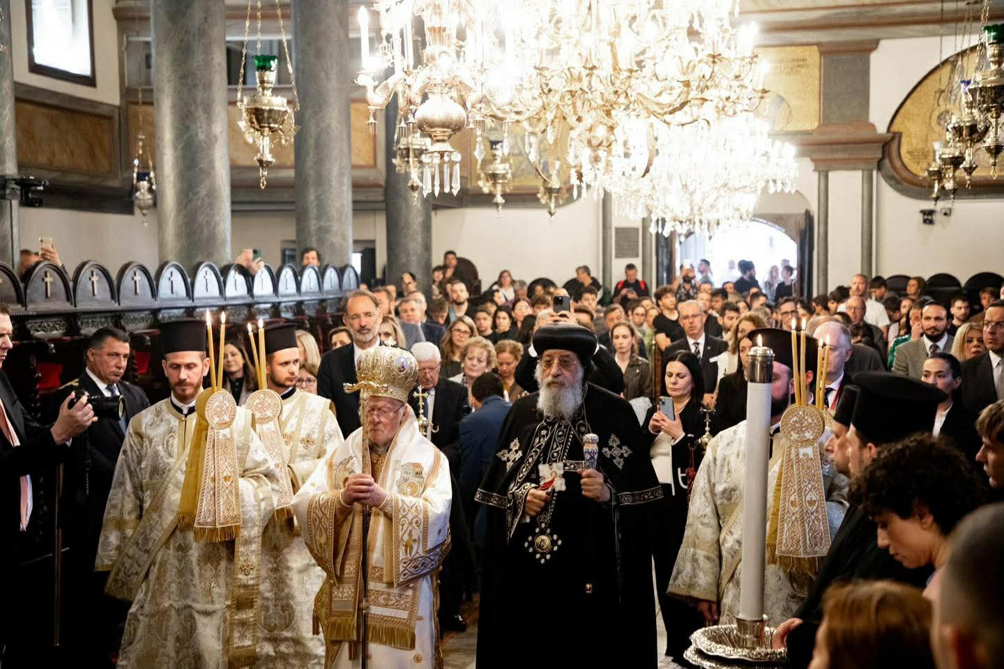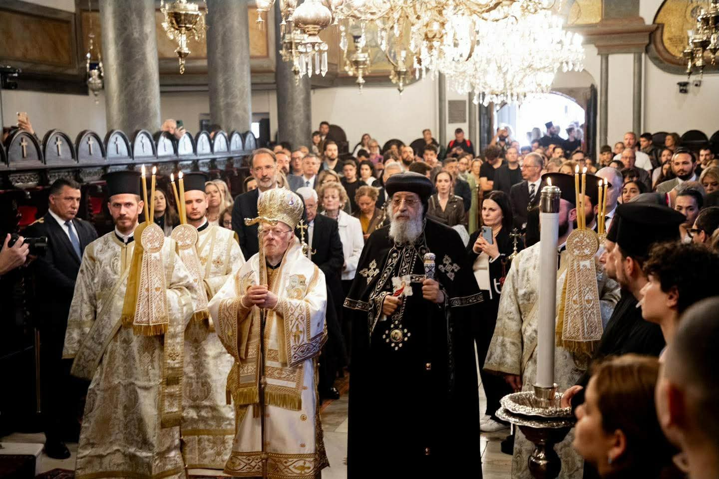 وعقب انتهاء القداس تم تبادل الكلمات بين صاحبي القداسة حيث ألقى قداسة البطريرك المسكوني كلمة رحب فيها بقداسة البابا تواضروس الثاني لافتًا إلى أنه في أحد حاملات الطيب، نقدم الشكر لإله الحياة، الذي اختار أن يكشف سر القيامة أولاً ليس للرسل، بل لتلاميذه الأمناء، نساء حاملات الطيب القديسات - أولئك الخادمات الثابتات اللواتي جئن حاملات الطيب بتفانٍ للرب. أصبحت هؤلاء النساء المباركات أول من بشّر بالقبر الفارغ، وأول من تلقى الوحي العجيب الذي يوحد المعاناة بالمجد، والصليب بالقيامة. يتردد صدى مثالهن عبر العصور كدعوة لنا جميعًا: للانتقال من الخوف إلى الإيمان، ومن اليأس إلى الرجاء، ومن القطيعة إلى الأُخُّوة.