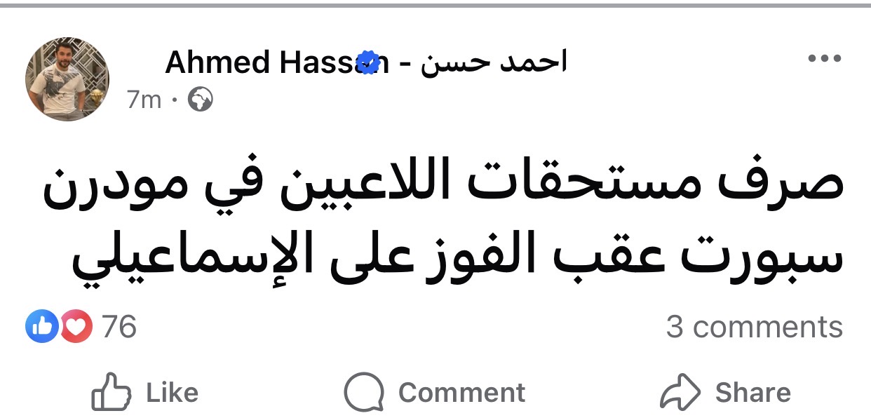 وكتب أحمد حسن، عبر حسابه الشخصي بموقع فيسبوك: “صرف مستحقات اللاعبين في مودرن سبورت عقب الفوز على الإسماعيلي”.