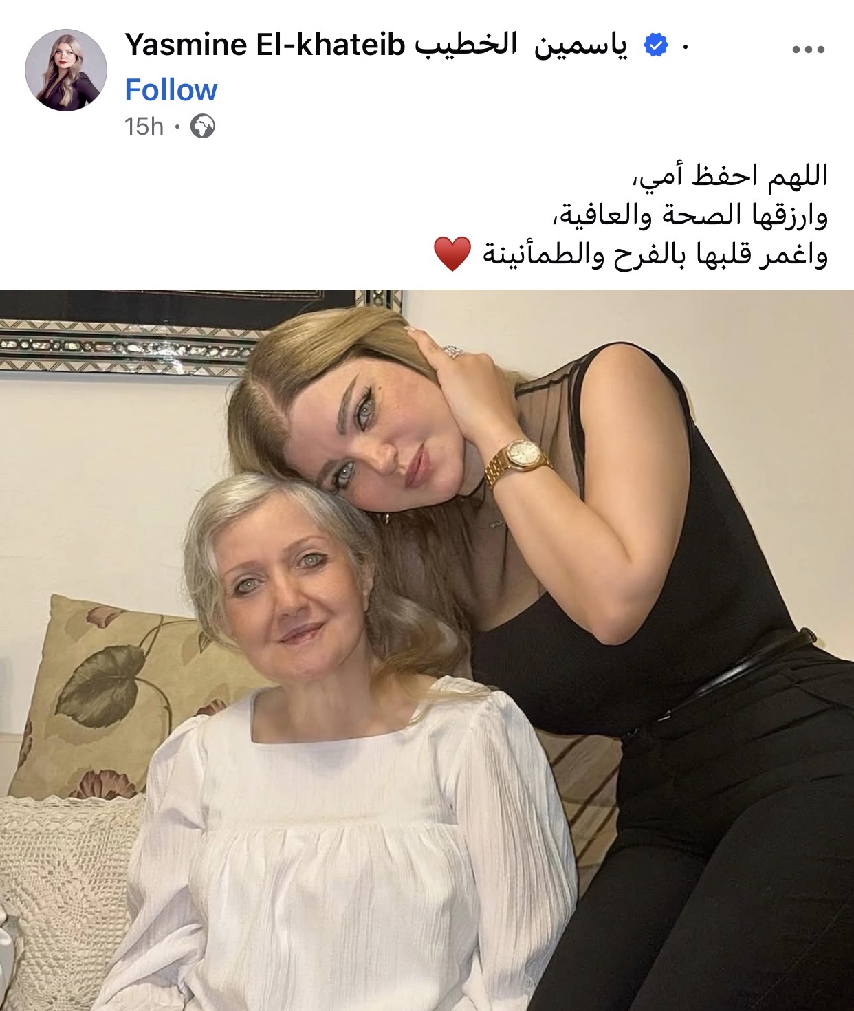 وعلقت ياسمين الخطيب على الصورة قائلة: "اللهم احفظ أمي، وارزقها الصحة والعافية وأغمر قلبها بالفرح والطمأنينة ".