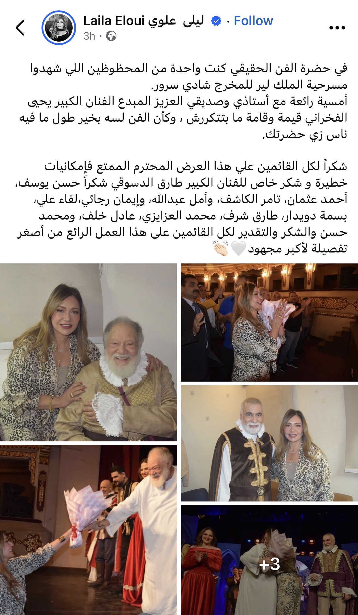 وكتبت ليلى علوي عبر حسابها الرسمي على موقع فيسبوك: “في حضرة الفن الحقيقي كنت واحدة من المحظوظين اللي شهدوا مسرحية الملك لير للمخرج شادي سرور، أمسية رائعة مع أستاذي وصديقي العزيز المبدع الفنان الكبير يحيى الفخراني، قيمة وقامة ما بتتكررش”.