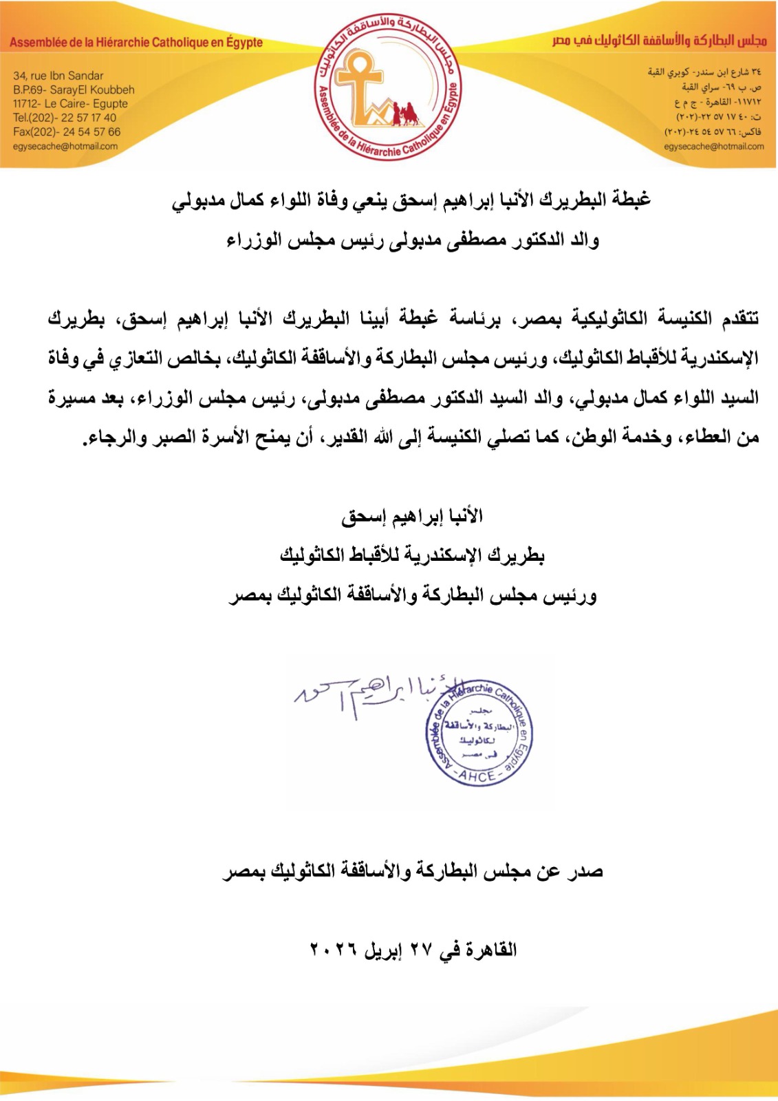 قدمت الكنيسة الكاثوليكية بمصر، برئاسة غبطة البطريرك الأنبا إبراهيم إسحق، بطريرك الإسكندرية للأقباط الكاثوليك، ورئيس مجلس البطاركة والأساقفة الكاثوليك، التعازي في وفاة السيد اللواء كمال مدبولي، والد الدكتور مصطفى مدبولي، رئيس مجلس الوزراء، بعد مسيرة حافلة بالعطاء وخدمة الوطن.