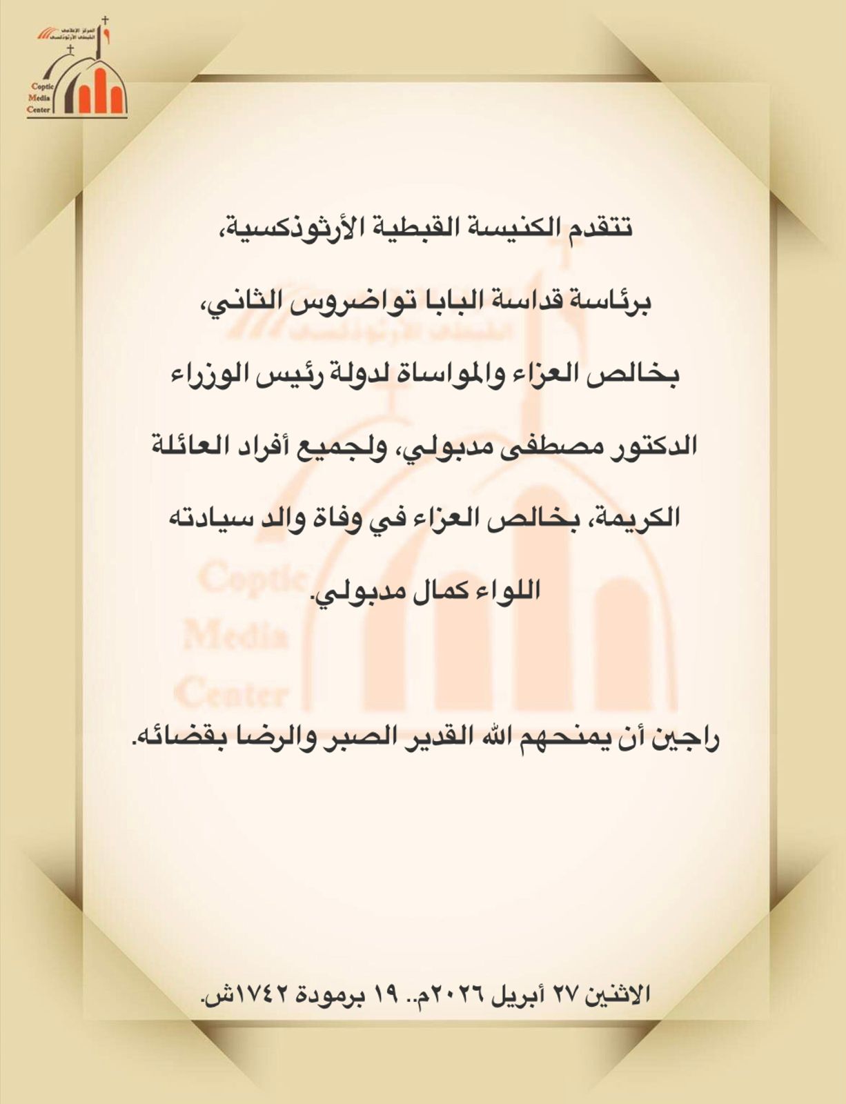 تتقدم الكنيسة القبطية الأرثوذكسية، برئاسة قداسة البابا تواضروس الثاني، بابا الإسكندرية وبطريرك الكرازة المرقسية، بخالص العزاء والمواساة لدولة رئيس مجلس الوزراء الدكتور مصطفى مدبولي، ولجميع أفراد العائلة الكريمة، في وفاة والد سيادته اللواء كمال مدبولي.