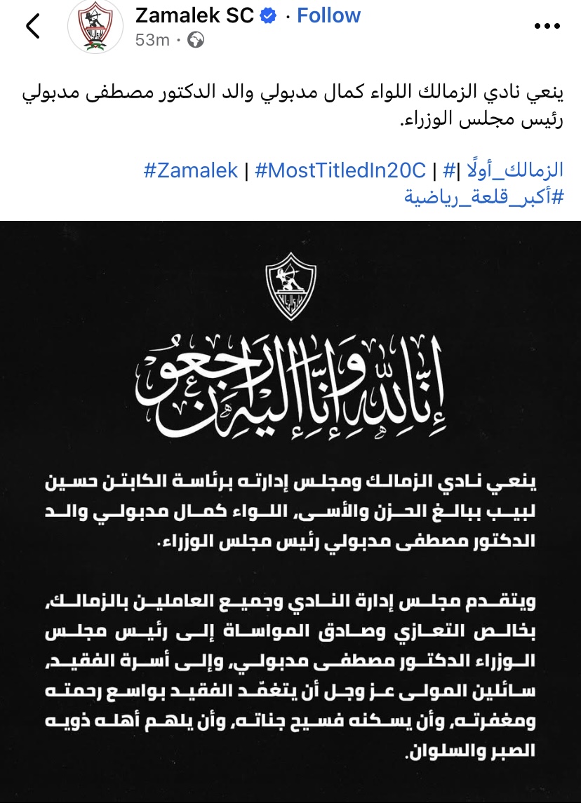 وقالت صفحة نادي الزمالك في البيان :"ينعى نادى الزمالك اللواء كمال مدبولى والد الدكتور مصطفى مدبولى رئيس مجلس الوزراء".