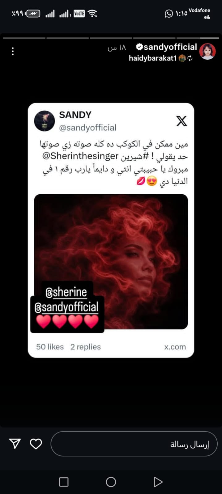ونشرت ساندي أغنية الحضن شوك لشيرين عبدالوهاب معلقة: مين ممكن في الكوكب ده كله صوته زي صوتها حد يقولي، شيرين مبروك يا حبيبتي أنتي دايما يارب رقم 1 في الدنيا دي.
