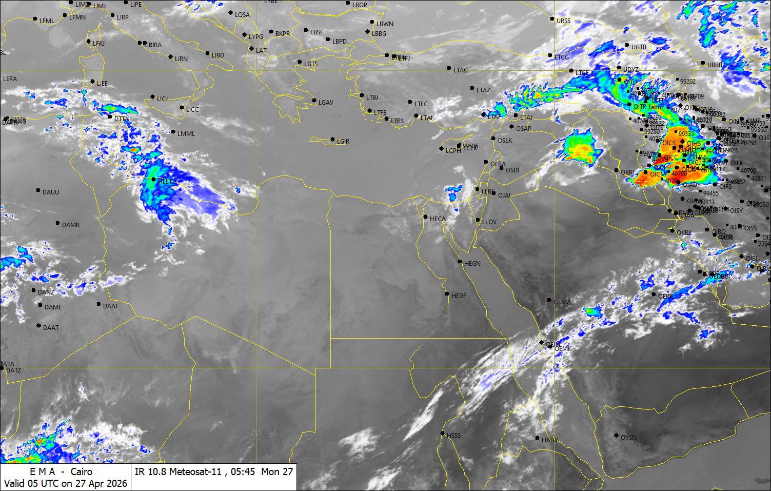 نشرت هيئة الأرصاد الجوية، صورًا للأقمار الصناعية وخرائط الطقس، تشير إلى استمرار تكاثر السحب المنخفضة والمتوسطة على مناطق من السواحل الشمالية الشرقية وشمال ووسط سيناء ومدن القناة يصاحبها فرص سقوط أمطار خفيفة إلى متوسطة.
