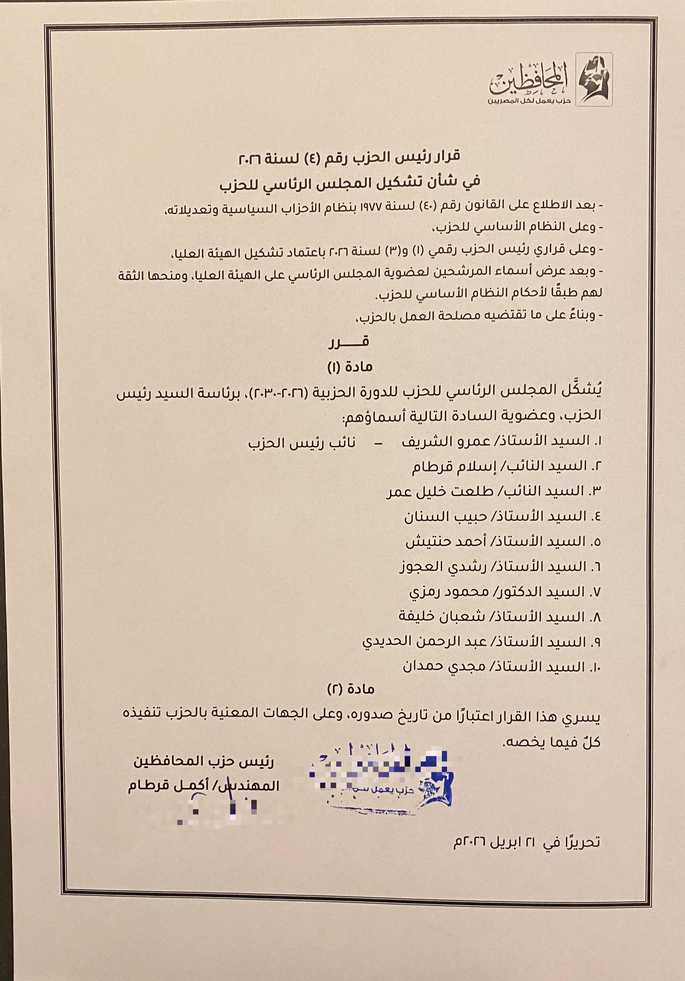 أصدر المهندس أكمل قرطام، رئيس حزب المحافظين، القرار رقم (4) لسنة 2026، بشأن إعادة تشكيل المجلس الرئاسي للحزب للدورة الحزبية الجديدة التي تمتد من عام 2026 وحتى عام 2030.
