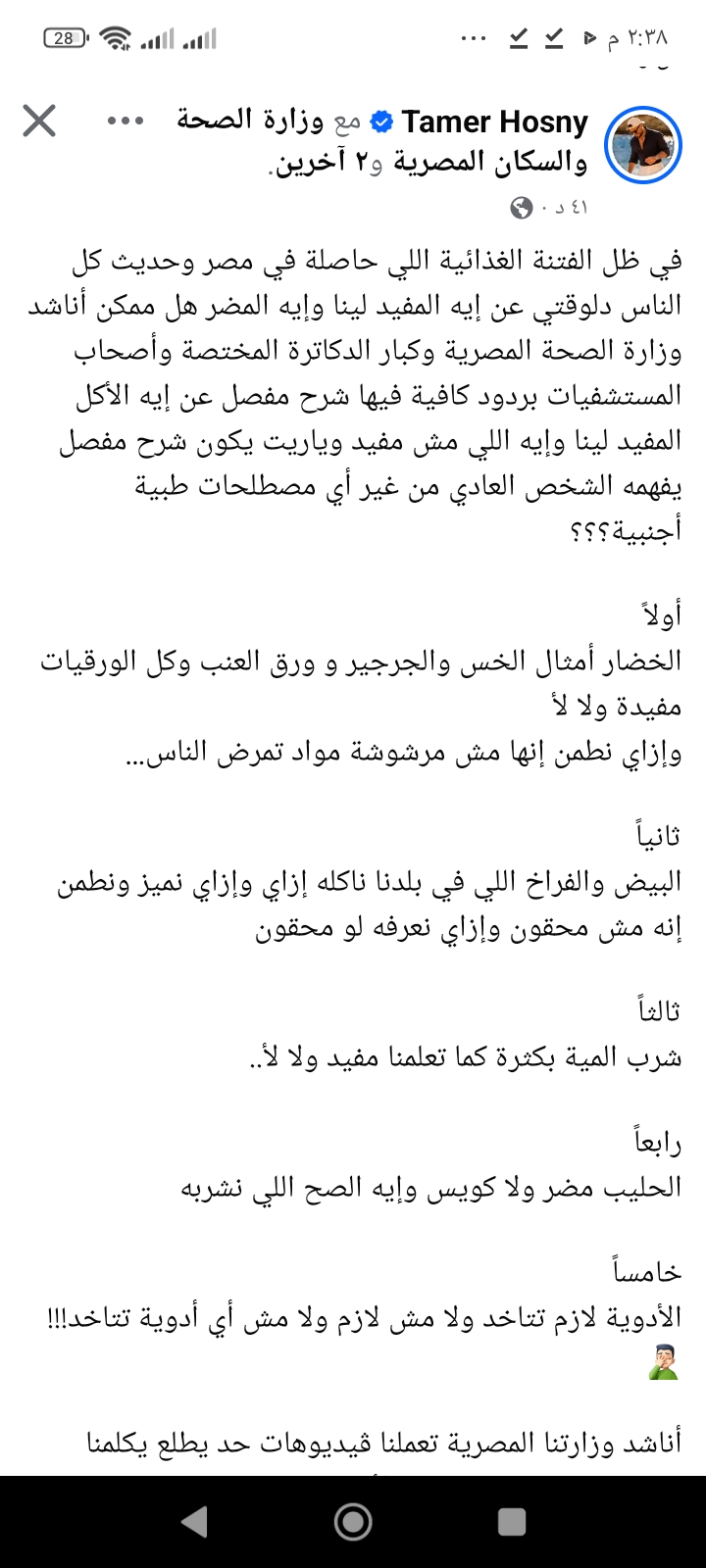 وطالب تامر حسني في منشوره الجهات المختصة، وعلى رأسها وزارة الصحة والسكان، بالتدخل وتقديم توضيحات شاملة ومبسطة للمواطنين، تتضمن شرحًا واضحًا للأطعمة الصحية وغير الصحية، بعيدًا عن المصطلحات الطبية المعقدة.