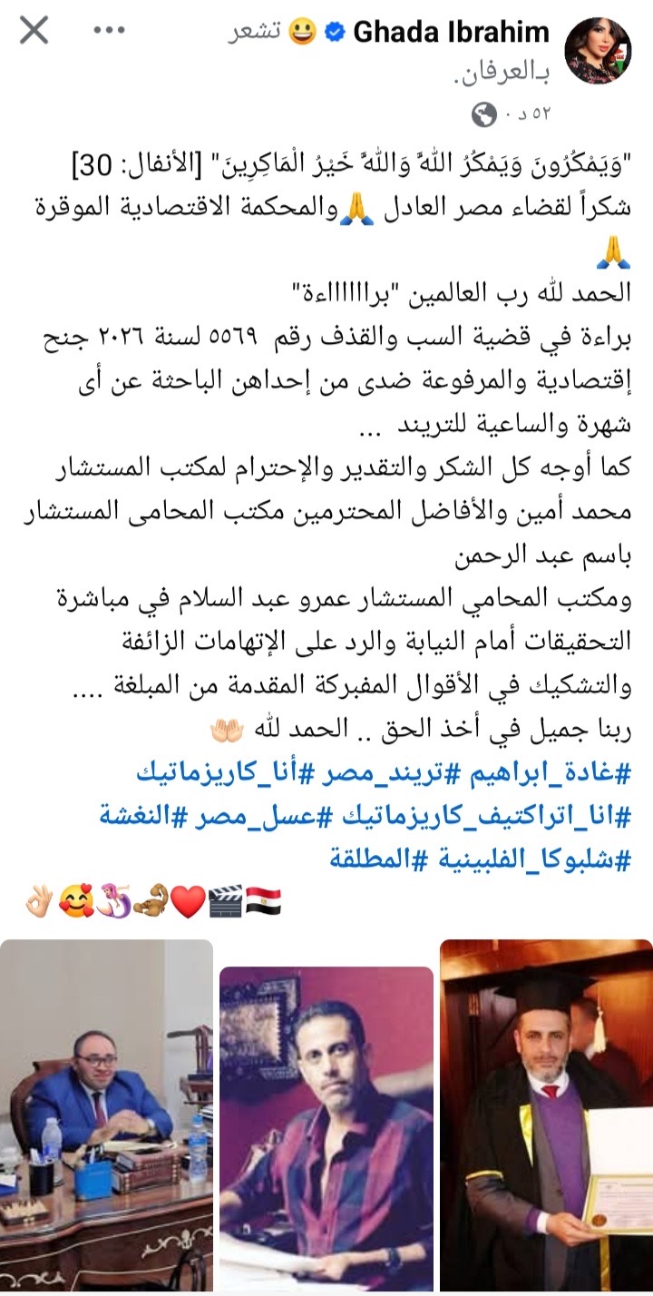 كما وجهت غادة إبراهيم الشكر لفريق دفاعها القانوني، المستشارين محمد أمين، وباسم عبد الرحمن، وعمرو عبد السلام، الذين تولوا متابعة القضية والدفاع عنها أمام جهات التحقيق.