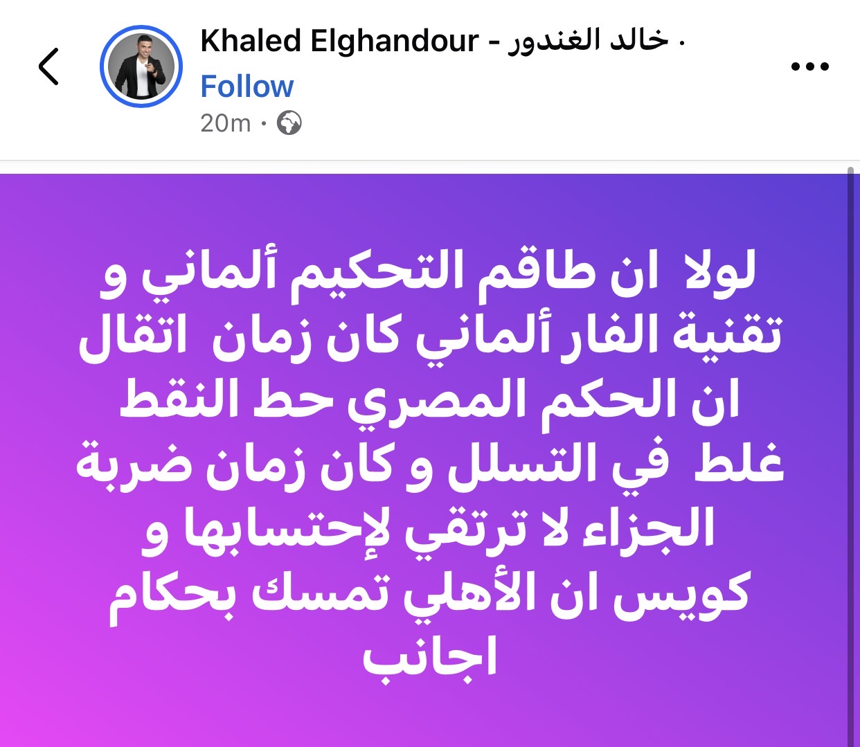 وكتب الغندور عبر حسابه على “فيسبوك”: “لولا إن طاقم التحكيم ألماني وتقنية الفار ألماني، كان زمان اتقال إن الحكم المصري حط النقط غلط في التسلل، وكان زمان ضربة الجزاء لا ترتقي لاحتسابها، وكويس أن الأهلي تمسك بحكام أجانب”.
