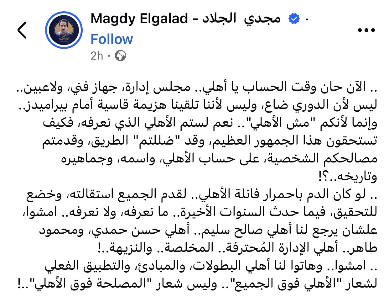 وكتب الجلاد عبر حسابه على “فيسبوك”: “الآن حان وقت الحساب يا أهلي.. مجلس إدارة، جهاز فني، ولاعبين.. ليس لأن الدوري ضاع، وليس لأننا تلقينا هزيمة قاسية أمام بيراميدز، وإنما لأنكم مش الأهلي”.