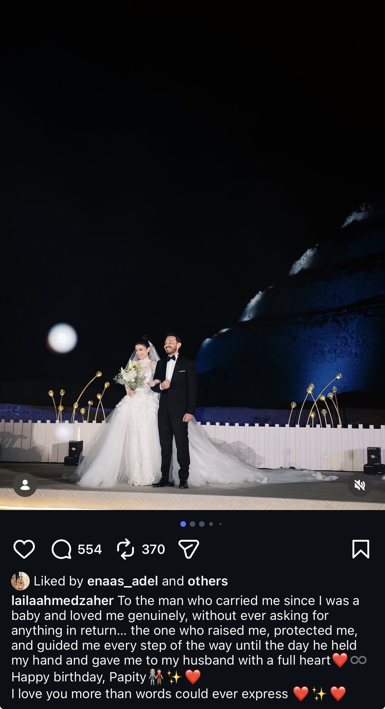 وتابعت: “الرجل الذي رباني، وأرشدني في كل خطوة حتى اليوم الذي أمسك بيدي وأعطاني لزوجي بقلب ممتلئ”.