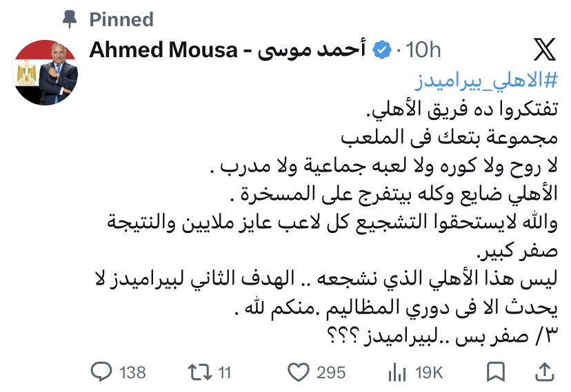 وكتب أحمد موسى عبر حسابه الرسمى على منصة X، منتقدا مستوى الفريق: "تفتكروا ده فريق الأهلى؟ مجموعة بتعك فى الملعب.. لا روح ولا كورة ولا لعبة جماعية، والمدرب ضايع، والكل بيتفرج على المسخرة".