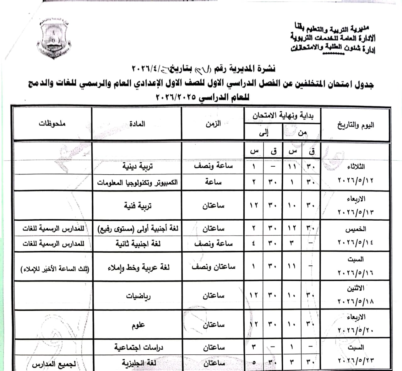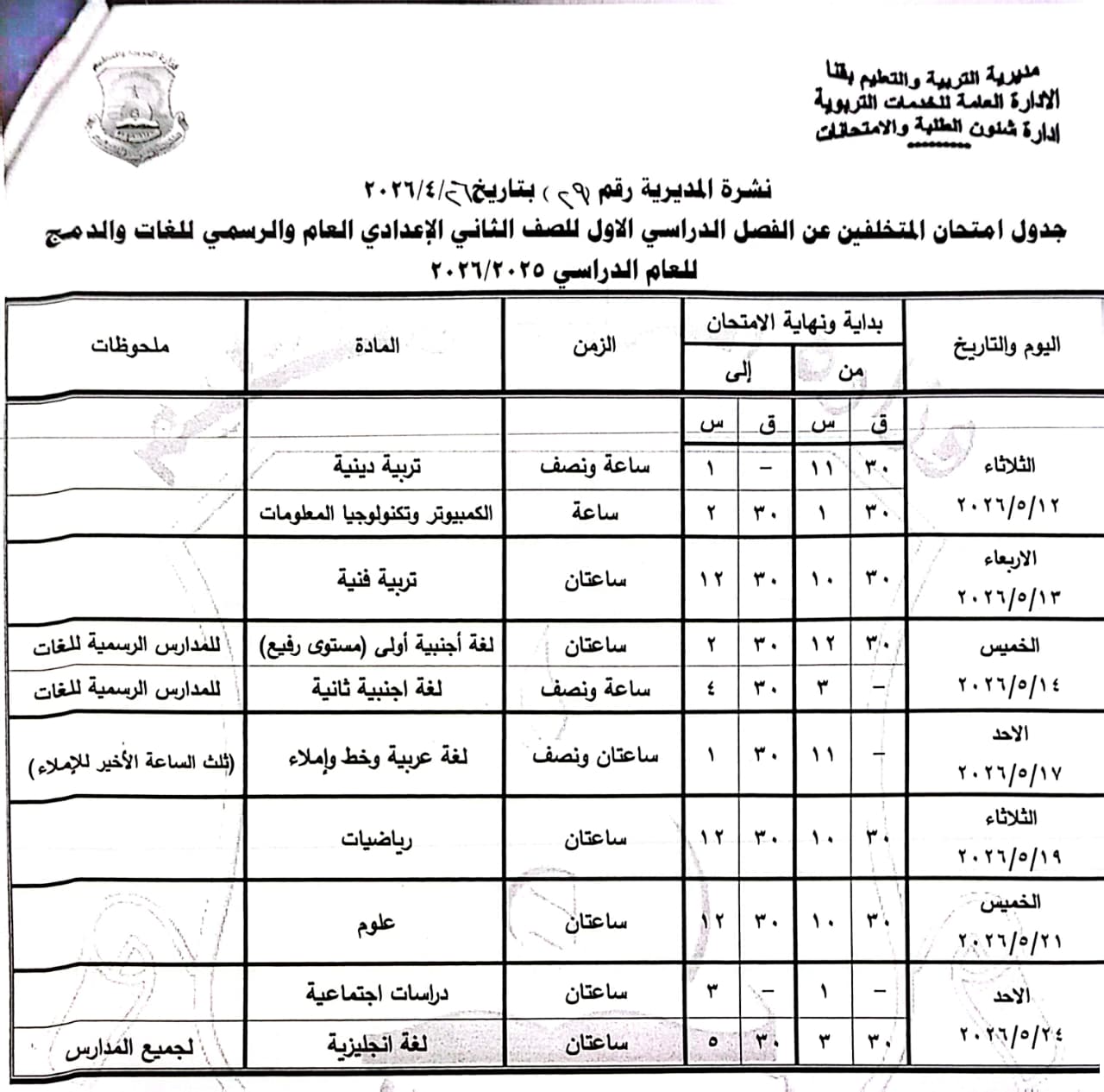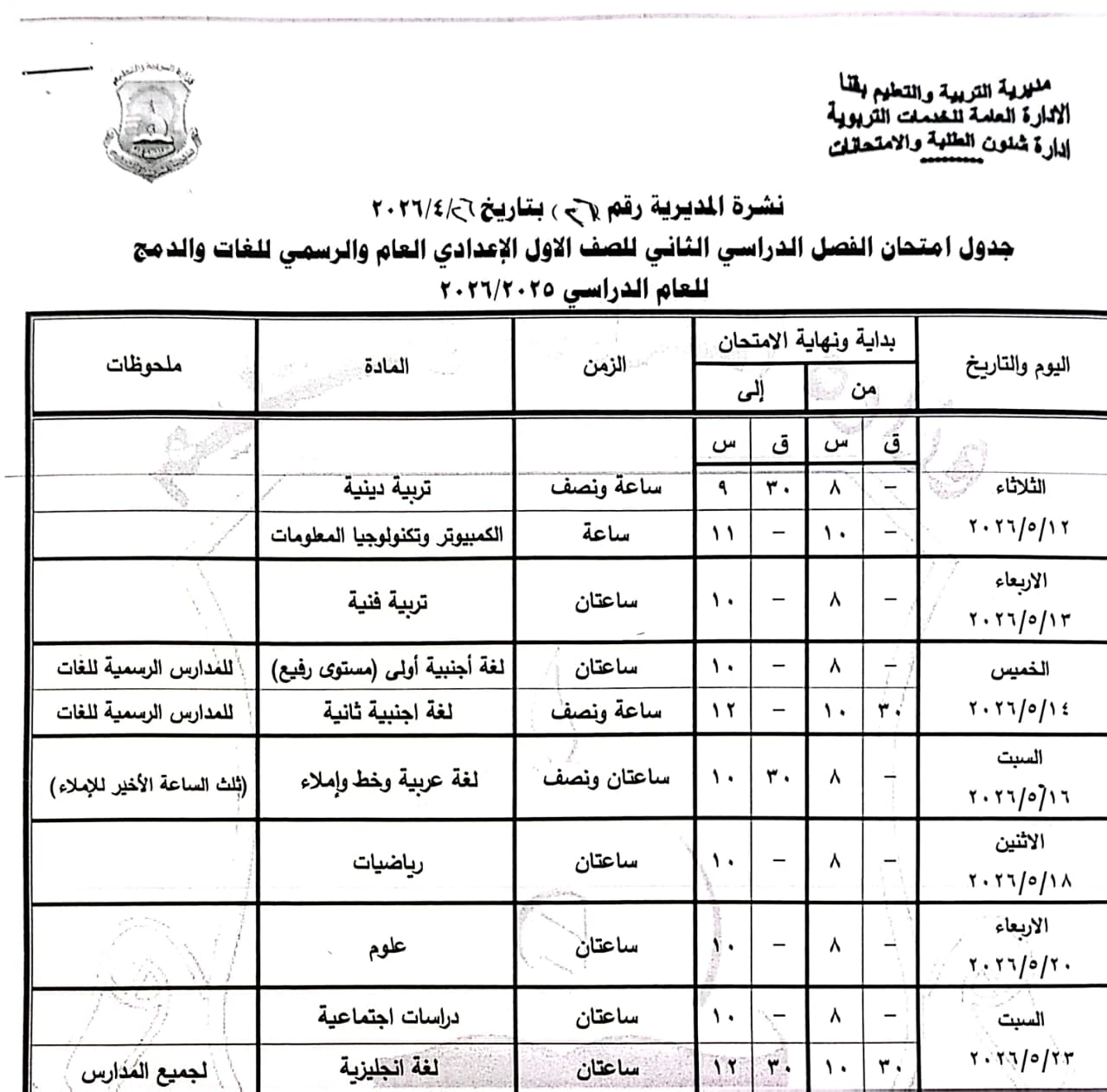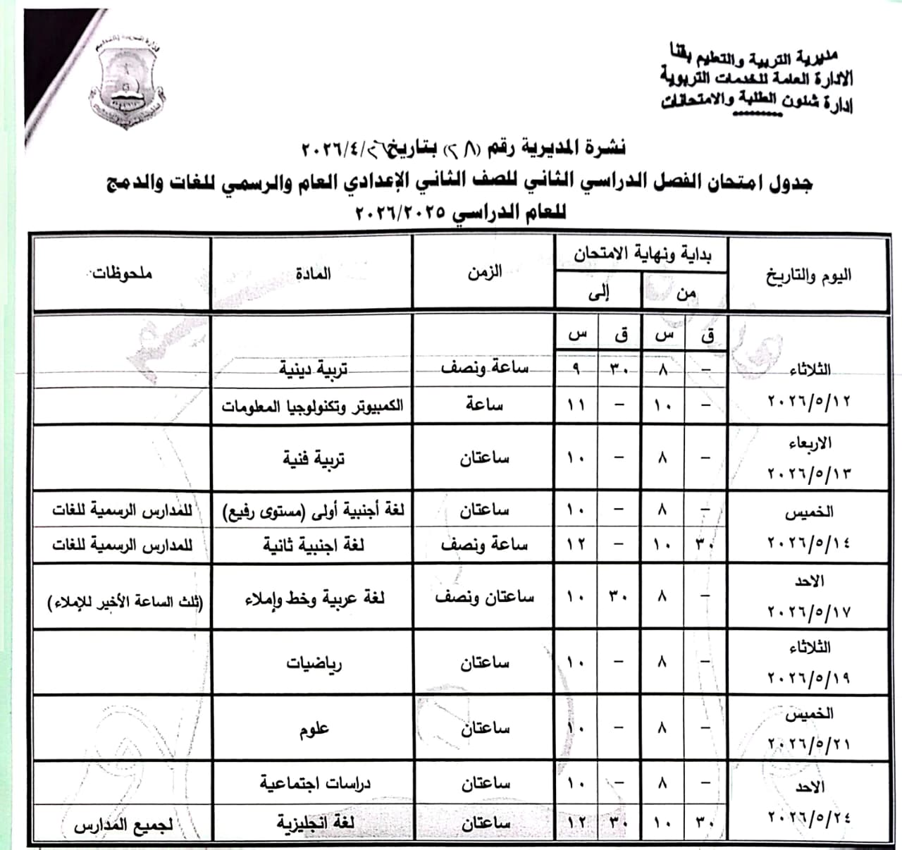 الصف الثاني الإعدادي “عام/لغات”: من الأحد 17 مايو وحتى الأحد 24 مايو 2026.