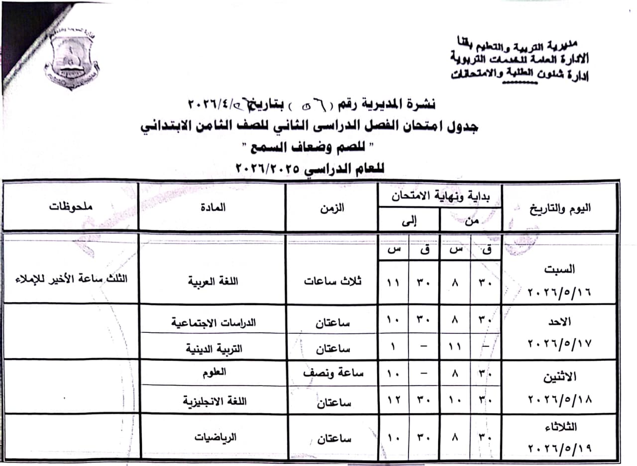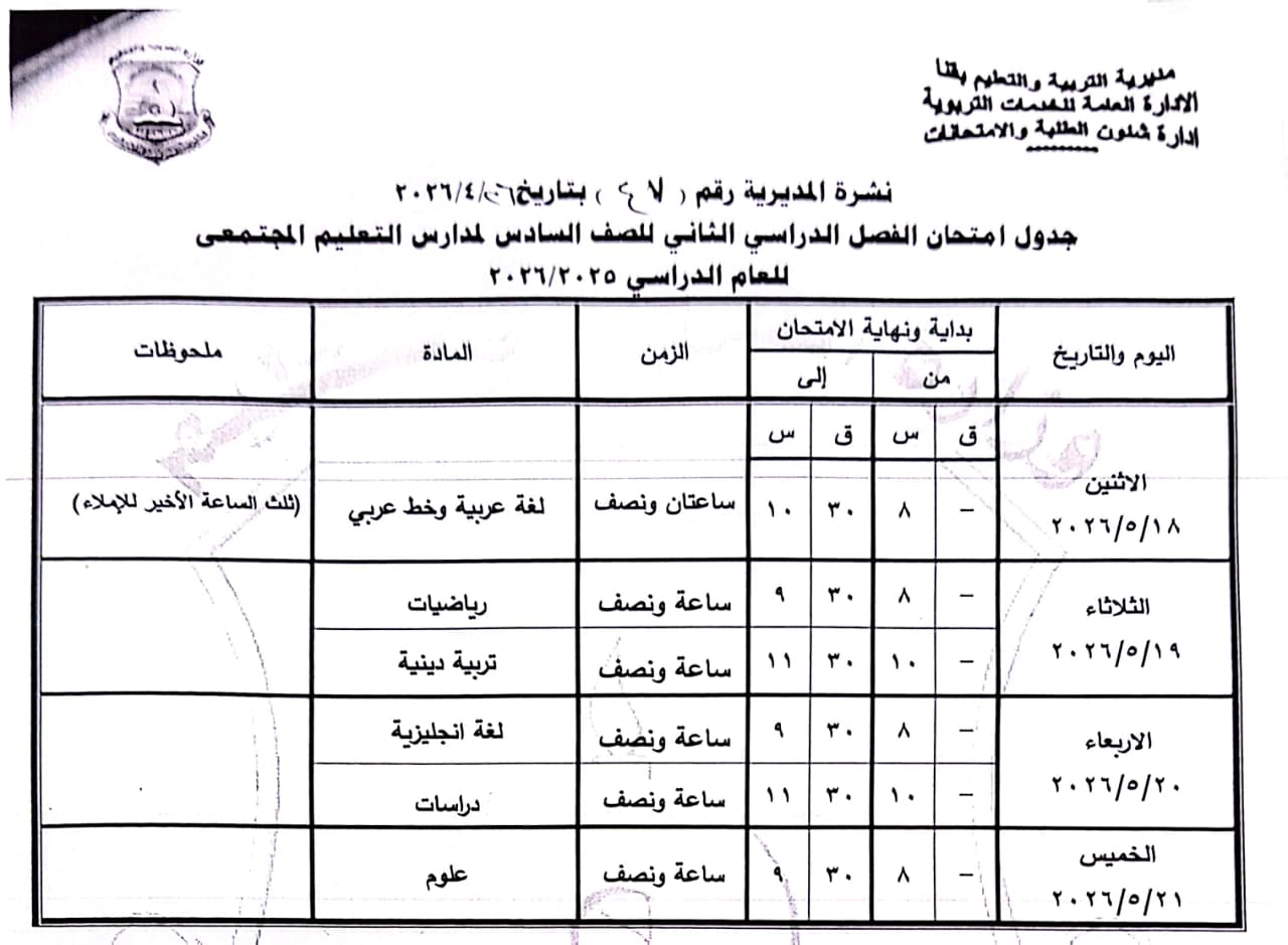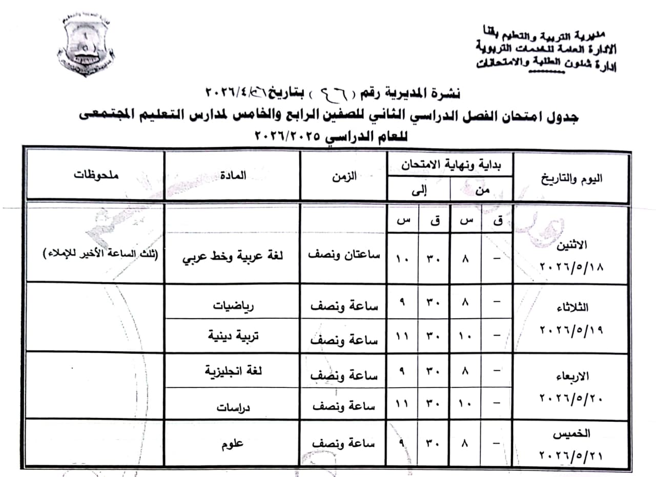 الصفين الخامس والسادس الابتدائي: من الأربعاء 20 مايو وحتى الأحد 24 مايو 2026.
